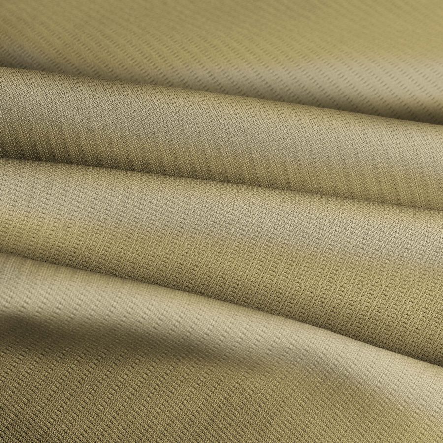 La tela base de este tejido técnico transpirable Fresh está compuesta en un 100% por poliéster, con un gramaje de 135 gr/m2 y un ancho de 150 cm. En cuanto a su color liso impreso, nos encontramos con un amarillo viejo cuyo CMYK es 12 17 54 1, lo que indica que es un tono cálido y terroso con un bajísimo porcentaje de tinta negra en su impresión.