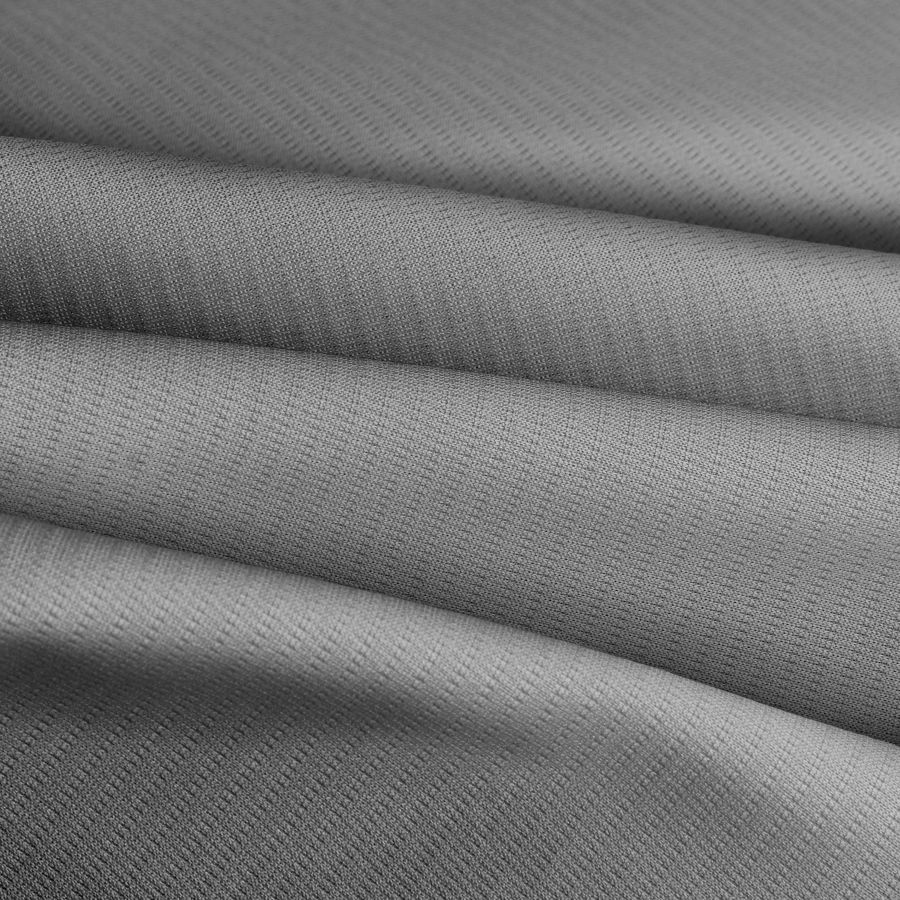 La tela base es el Tejido Técnico Transpirable – Fresh, compuesta por 100% POLIÉSTER, con un gramaje de 135 gr/m2 y un ancho de 150 cm. El color liso impreso es de un gris oscuro medio con el siguiente contenido de CMYK: 36 28 28 7. Este color secundario es ideal para combinar con tonos neutros como el blanco, negro y gris claro, pero también se puede complementar con colores vibrantes, como los azules o los verdes, dando lugar a un aspecto elegante y sofisticado. La tela base está impresa con el color liso a una sola cara por impresión digital textil, y no es un tejido tintado sino impreso por una sola cara.