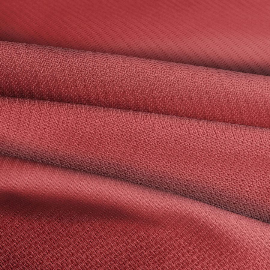La tela base, Tejido Técnico Transpirable - Fresh, está compuesta por 100% poliéster con un gramaje de 135 gr/m2 y un ancho de 150 cm. El color liso impreso en esta tela es Rojo Vino Francés, el cual contiene una mezcla de tintas de: Cyan: 0, Magenta: 82, Yellow: 60 y Black: 33, reflejando un tono cálido y profundo en la tela. Este color se combina armoniosamente con tonos marrones y ocres, así como con tonalidades neutras como el blanco y el negro.