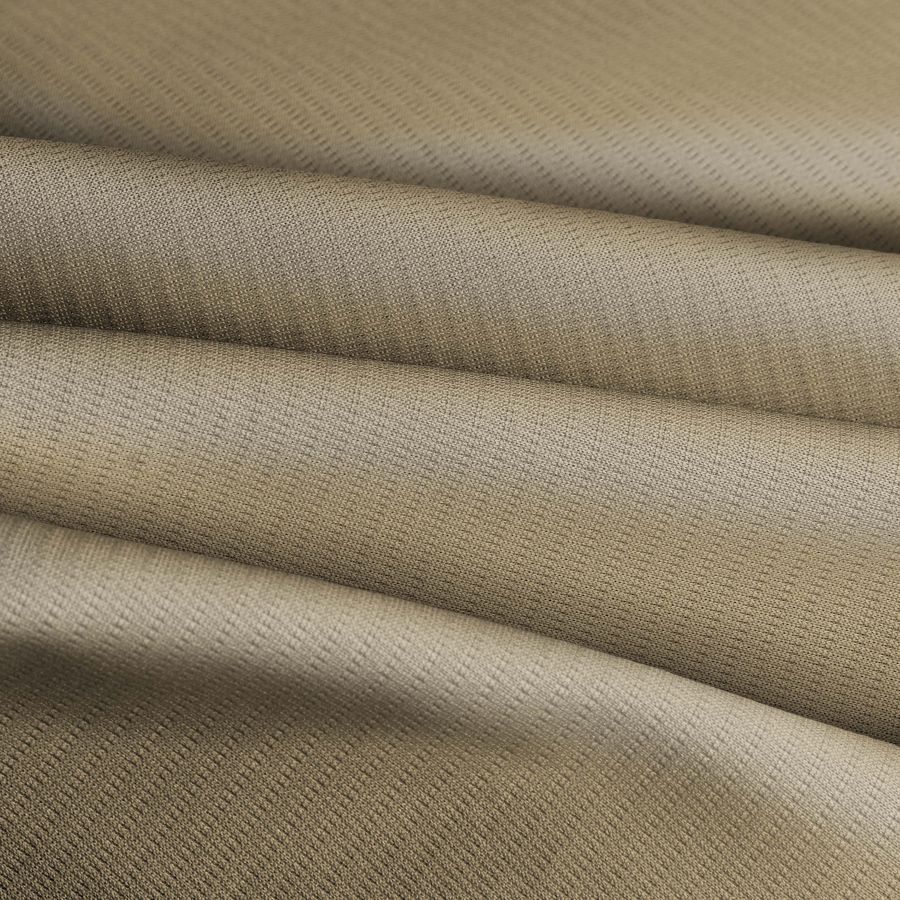 El tejido técnico transpirable - Fresh, compuesto por 100% poliéster, tiene un gramaje de 135 gr/m2 y un ancho de 150 cm. Está impreso con un color liso de tonalidades verde-avellana, con un CMYK de 18 24 47 4. El color resulta de una combinación equilibrada de cian, magenta, amarillo y negro que aporta un tono natural y suave, con un toque de frescura. El color secundario, que se destaca en el tejido, es el amarillo suave, el cual se combina armoniosamente con tonos verdes, marrones y ocres.