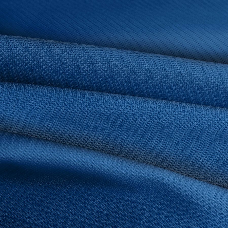 El tejido técnico transpirable Fresh de 100% poliéster, con un gramaje de 135 gr/m2 y un ancho de 150 cm, tiene una base de color blanco y se puede imprimir en una sola cara con colores sólidos mediante la técnica de sublimación. El color impreso azul oscuro (Cyan: 100, Magenta: 82, Yellow: 32, Black: 15) es intenso y vibrante, con un matiz frío que le confiere un aire de sofisticación y elegancia. Este color combina perfectamente con los tonos verde oscuro y gris marengo, lo que permite crear diseños con un contraste cromático elevado.