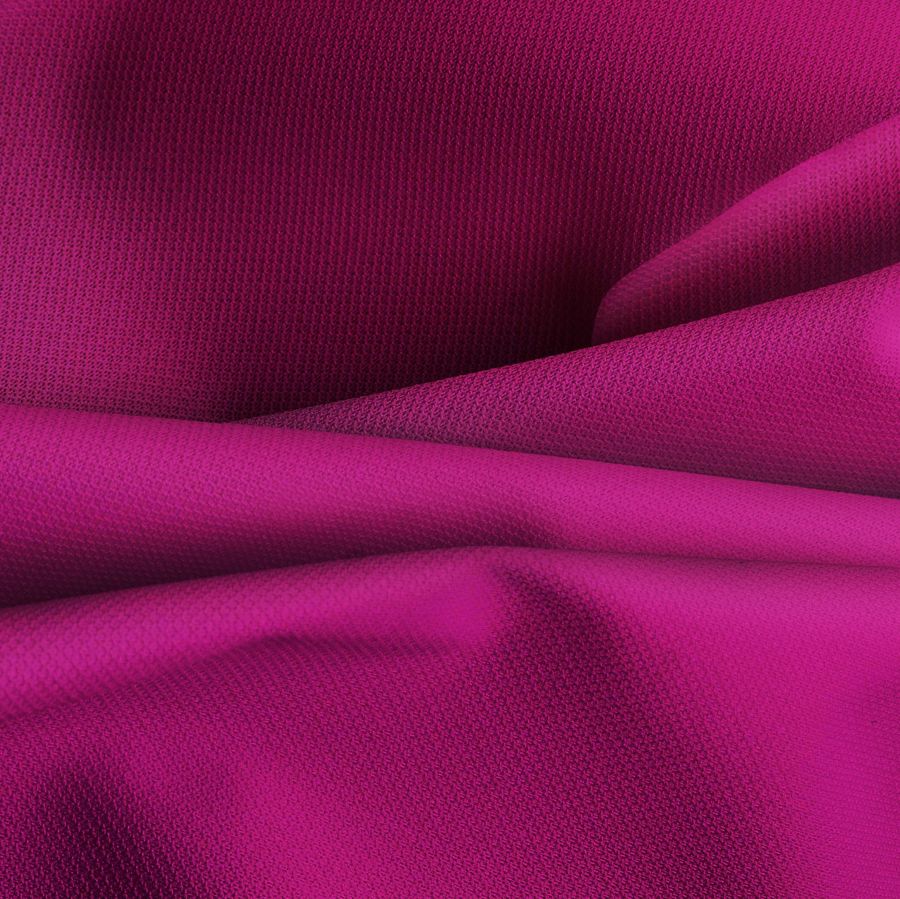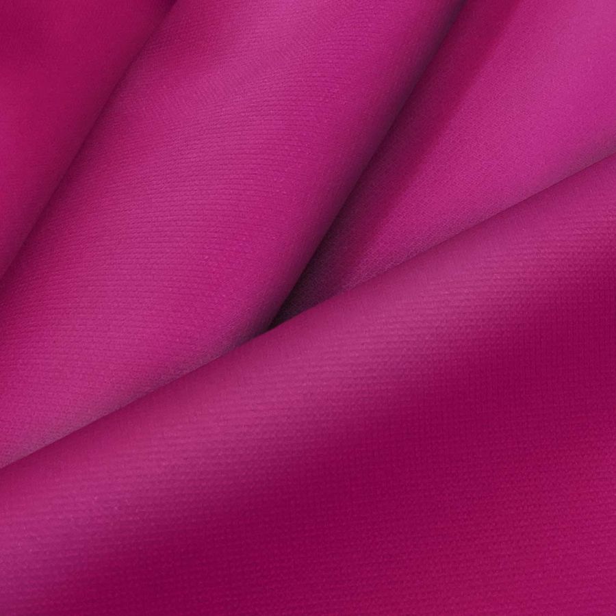 La tela base utilizada es la Tela Cortavientos Impermeable - Target, una tela técnica compuesta por 100% poliéster que tiene un gramaje de 116 gr/m2 y un ancho de 145 cm. Cuenta con características que la hacen ideal para su uso en moda y deporte, especialmente en la temporada de invierno. El color liso impreso es un hermoso tono de morado con un toque de violeta rojizo que se logra mediante una combinación de tintas CMYK, con 33% de cian, 100% de magenta, 28% de amarillo y 25% de negro.