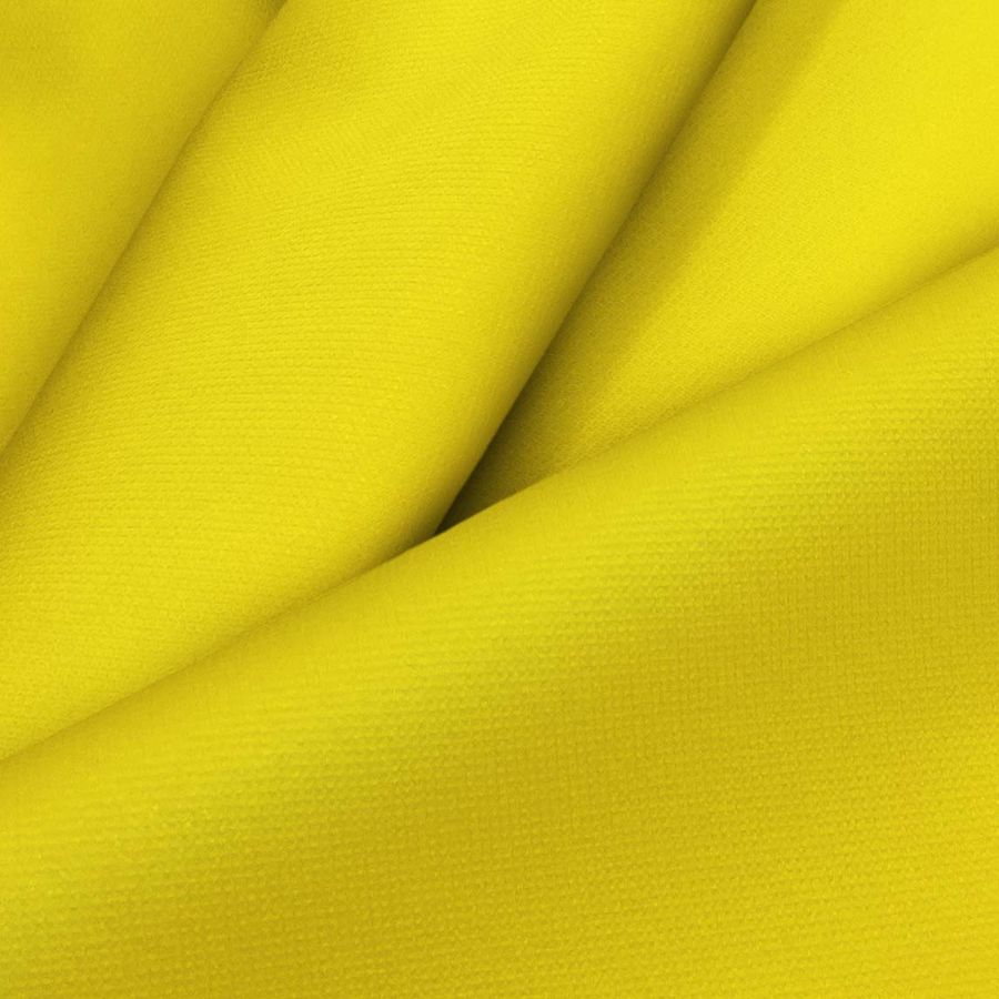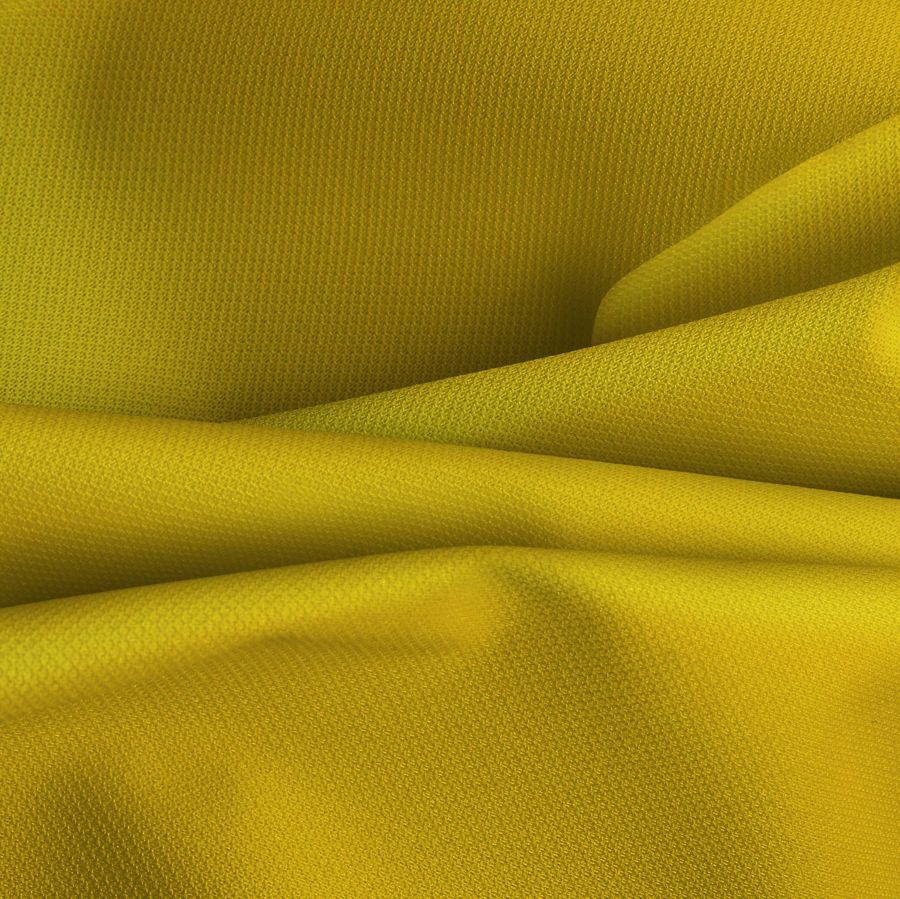La tela base es el Tejido Técnico Cortavientos Impermeable - Target, de composición 100% poliéster con un gramaje de 116 gr/m² y un ancho de 145 cm. El color liso impreso es de un amarillo huevo, que se obtiene a través de los siguientes valores CMYK: C:0, M:16, Y:91, K:0, lo que indica que la mayor cantidad de pigmento presente en este color es el amarillo. Este tono se asocia con la luz y la claridad, además de ser muy utilizado en la moda y el diseño gráfico, por ser un color llamativo y alegre. El amarillo huevo combina especialmente bien con tonos como morado, gris, azul marino y verde oliva.