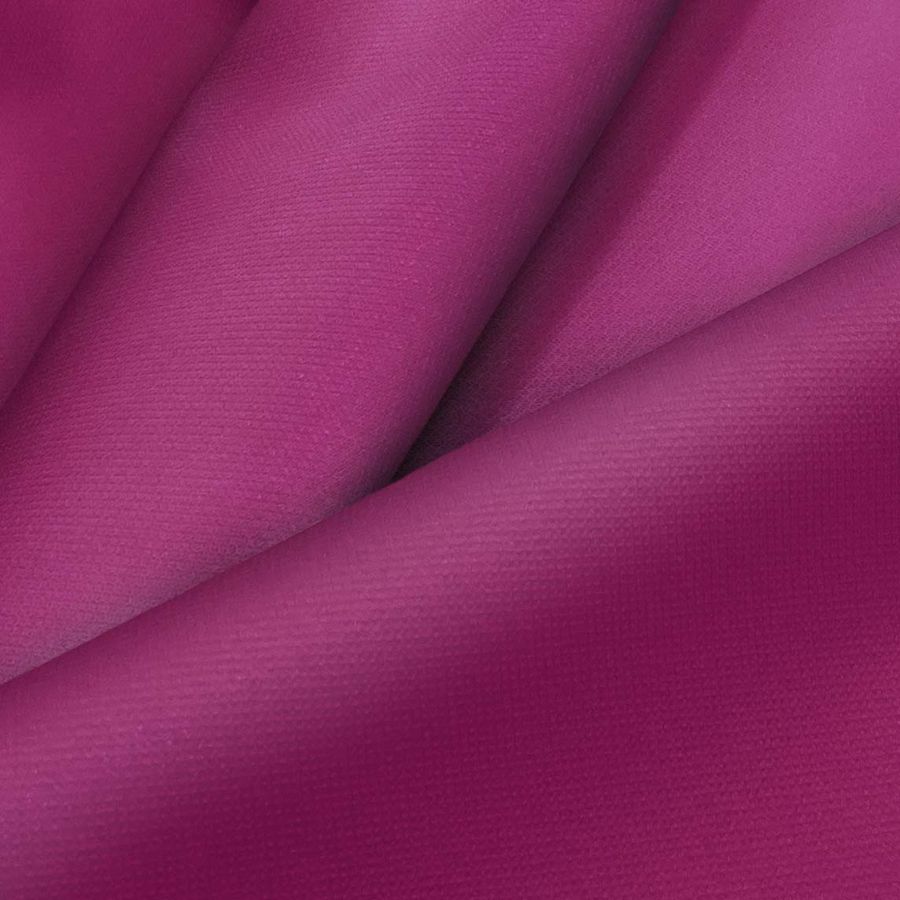 La tela base es la Tela Cortavientos Impermeable - Target, un tejido técnico compuesto en su totalidad por poliéster con un gramaje de 116 gr/m2 y un ancho de 145 cm. Además, esta tela cuenta con una impermeabilidad que resulta ideal para los deportistas y una textura delgada al tacto. El color liso impreso es un Morado Amatista Púrpura con una tinta Cyan del 42%, Magenta del 100%, Yellow del 28% y Black del 28%, lo que significa que el color es intenso y vibrante con tonos azulados y rosados. Este color combina bien con otras tonalidades de morado, rosa, azul y negro.