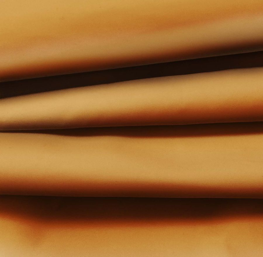 La tela base es la tela fina repelente al agua Storm, una tejido técnico de 100% poliéster con un gramaje de 70 g/m2 y un ancho de 145 cm que presenta acabado impermeable e hidrófugo. El color liso impreso en la tela es un cálido naranja canela, que se obtiene mediante la tinta de impresión digital textil con un CMYK de 24 62 92 16. Este color secundario es un tono tierra con matices rojizos que combina con otros tonos cálidos como el amarillo mostaza, el marrón café, y el rojo teja.