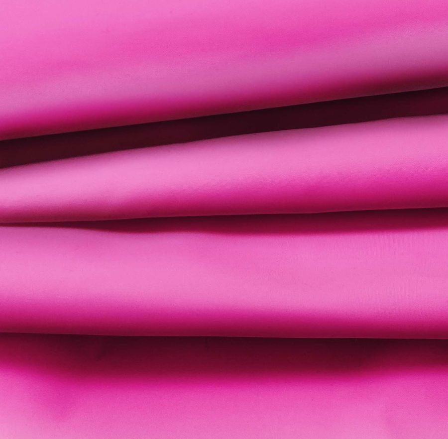 La tela base es la Tela Fina Repelente al Agua - Storm, un tejido técnico compuesto 100% de poliéster con un gramaje de 70 gr/m2 y un ancho de 145 cm. El color liso impreso en la tela es el Rosa Bonbon, con un CMYK de 0 83 0 0. Este color simboliza la feminidad, la dulzura y la sensibilidad, mientras que técnicamente es hidrofugo e impermeable. El rosa bonbon combina muy bien con el blanco, el gris claro y el tono piel. Es importante mencionar que el tejido está impreso a una sola cara por impresión digital textil, lo que significa que el color está presente solo en una de las superficies.