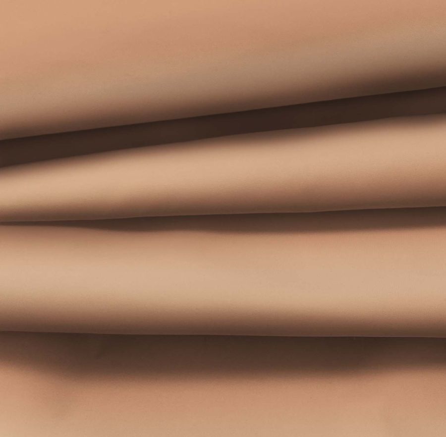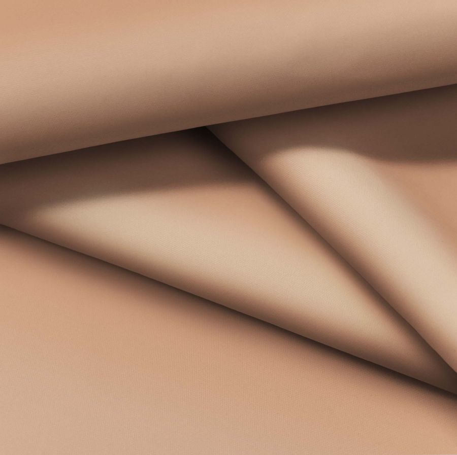 La tela base es una tela técnica fina repelente al agua, llamada Storm, compuesta de un 100% de poliéster con un gramaje de 70 gr/m2 y un ancho de 145 cm. El color liso impreso es un marrón arenisca, cuyo contenido del CMYK es de 19 de cian, 47 de magenta, 54 de amarillo y 7 de negro. Este color secundario tiene un simbolismo de serenidad y armonía, el color de la tierra brinda un sentido de estabilidad y conexión con la naturaleza. Combinado con otros colores, como el verde y el azul, se crea una sensación de calma y relajación en la mente. La tela está impresa con el color liso a una sola cara por impresión digital textil, por lo que no es un tejido tintado sino impreso por una sola cara.