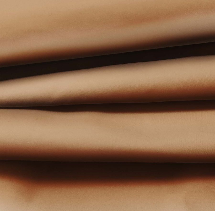 La tela base es la Tela fina repelente al Agua - Storm, compuesta por 100% poliéster con un gramaje de 70 gr/m2 y una anchura de 145 cm. El color liso impreso es un tono Marrón-Canela en Rama, con un CMYK de 30 56 70 28. Este color secundario es una mezcla entre marrón oscuro y tonos cálidos, lo que le aporta una sensación de confort y elegancia. En particular, combina bien con tonos terracota, beige y grises.