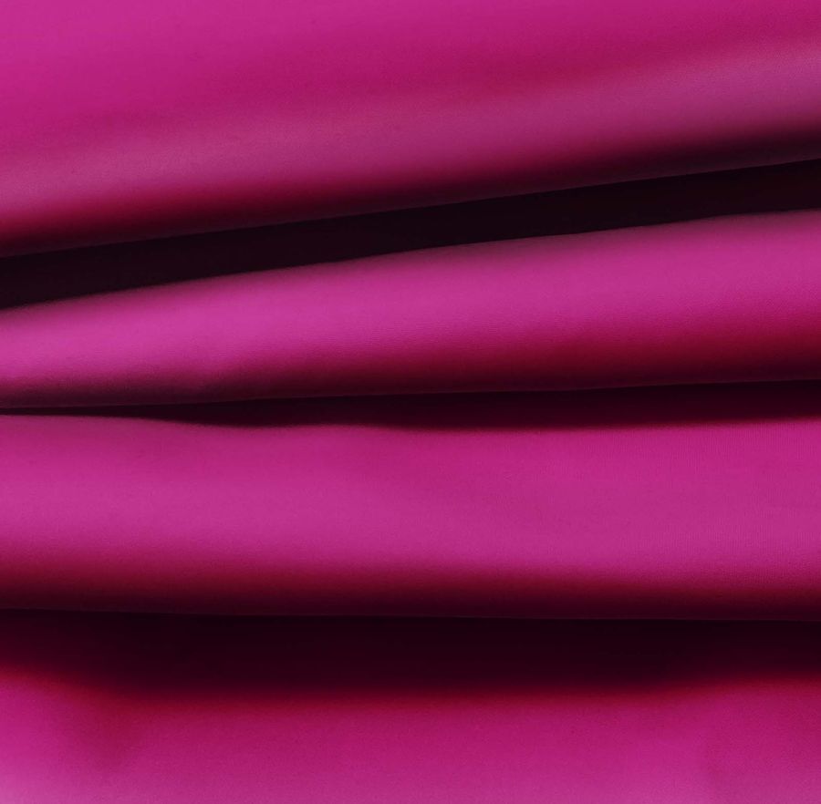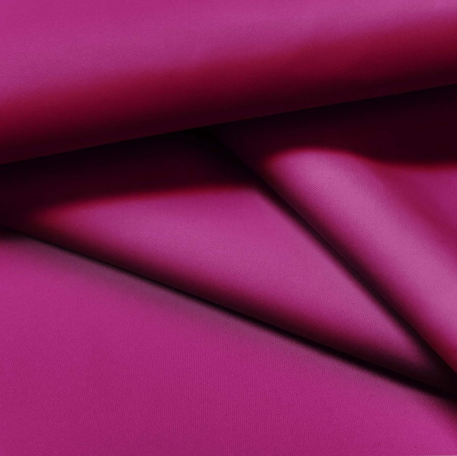 La tela base es la Tela Fina Repelente al Agua - Storm, con una composición del 100% de poliéster y un gramaje de 70 gr/m2. El color liso impreso en esta tela es un morado/violeta rojizo, con una combinación de tinta CMYK de 33% de cian, 100% de magenta, 28% de amarillo y 25% de negro.