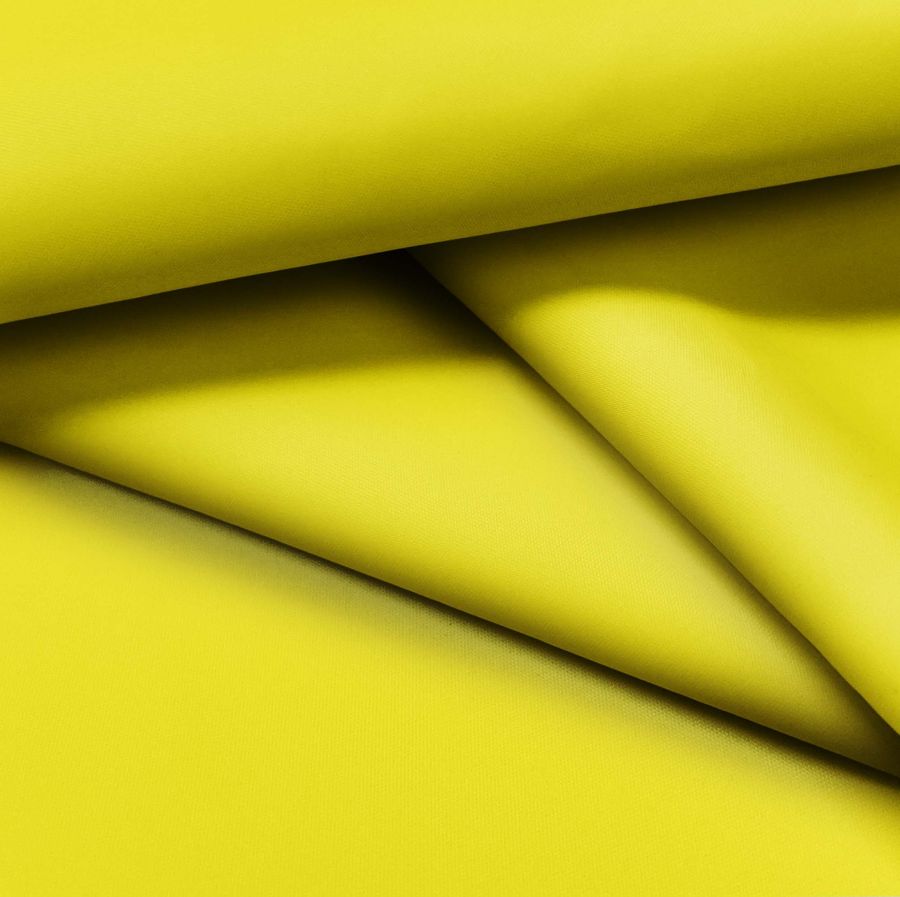 La tela base es la Tela Fina Repelente al Agua - Storm, un tejido técnico de 100% poliéster con un gramaje de 70 gr/m2 y un ancho de 145 cm. Su color liso impreso es brillante amarillo con valores de tinta cian 5, magenta 0, amarillo 90 y negro 0, y tiene un CMYK de 5 0 90 0. Este color secundario es muy vibrante y refleja energía y felicidad. El amarillo combina particularmente bien con colores como blanco, gris, negro, azul y verde, sin embargo, también se puede utilizar en combinaciones más atrevidas como amarillo y rosa o amarillo y turquesa.