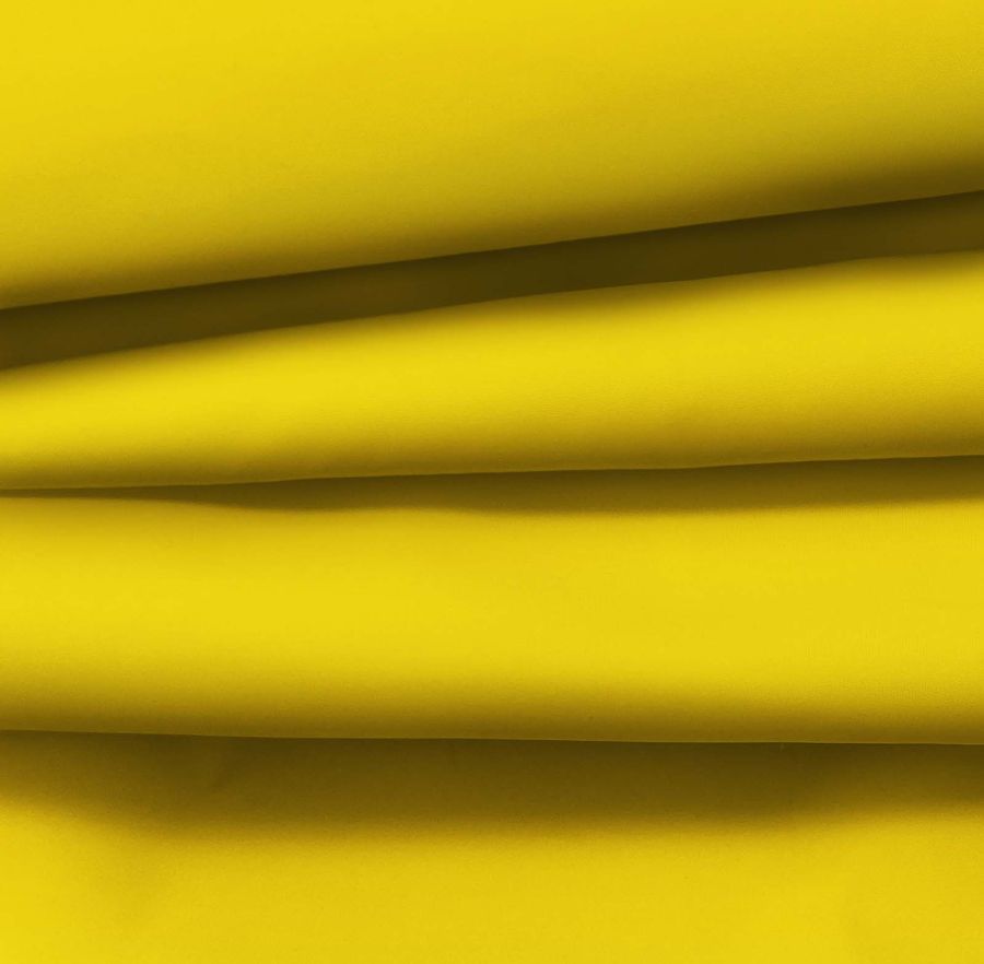 La tela base, Tela fina repelente al Agua - Storm, se compone de un 100% POLIÉSTER con un gramaje de 70 gr/m2 y tiene un ancho de 145 cm. El color impreso, Amarillo Cromo, destaca por su alto nivel de amarillo y una subida moderada de magenta y amarillo. Combinado con el negro que es nulo, el color secundario resultante es un amarillo cromado vibrante y claro. La tela está impresa en una única cara mediante impresión digital textil. Como características generales, la tela presenta un acabado impermeable e hidrófugo con una textura delgada y lisa al tacto.