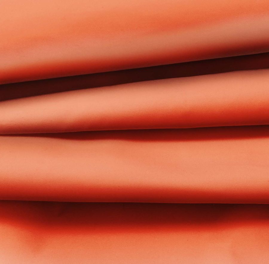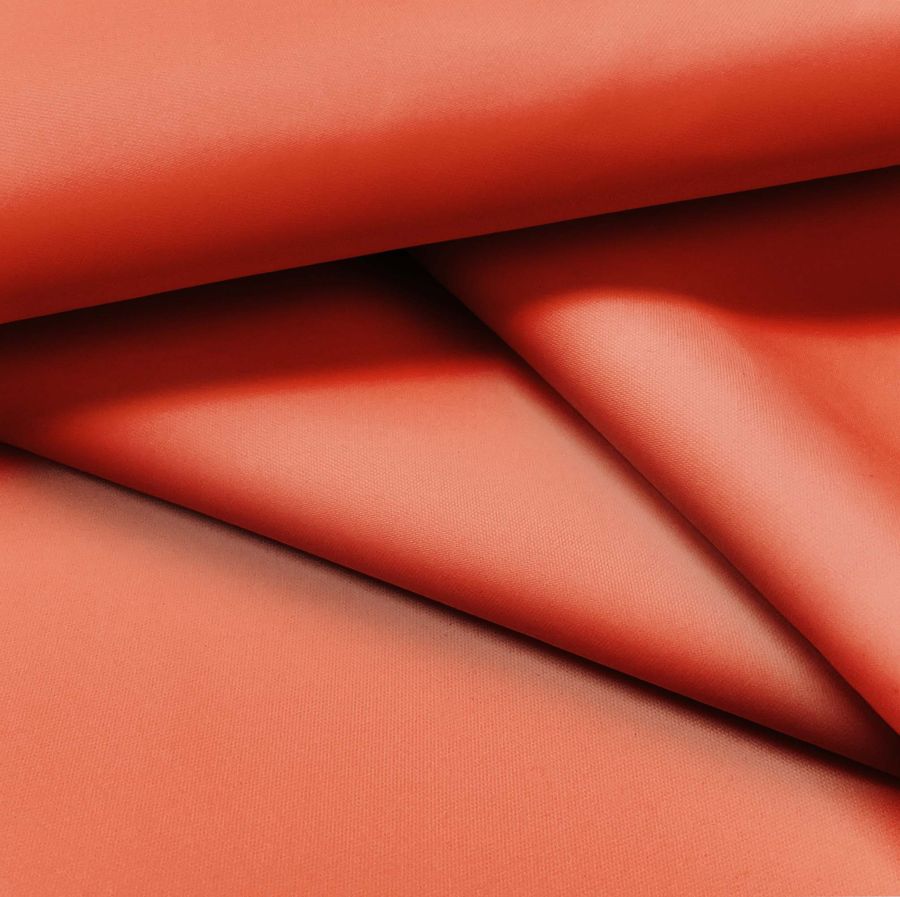 La tela base utilizada es Tela fina repelente al Agua - Storm, un tejido técnico compuesto al 100% de poliéster, con un gramaje de 70 gr/m2 y un ancho de 145 cm. El color liso impreso es Naranja Salmón, el cual se obtiene mediante la combinación de las tintas Magenta y Yellow en un 76% cada una en el sistema de impresión CMYK. Este tono de naranja suave se complementa especialmente bien con tonalidades neutras como el blanco o el gris, o tonos más fuertes como el azul oscuro o el verde musgo.