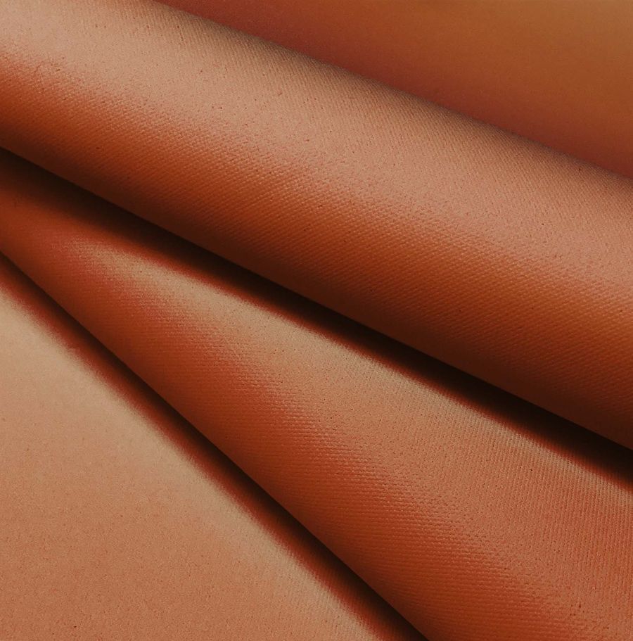 En cuanto a sus características generales, la tela base se distingue por su impermeabilidad y granulado rugoso al tacto, lo cual la hace ideal para aplicaciones en exteriores. Además, su opacidad asegura que los colores se perciban con una gran nitidez y se vean vivos y vibrantes. Todo esto combinado con el tono terroso y anaranjado del color liso de la tela, hace que sea una opción ideal para aplicaciones tanto de moda como de decoración.
