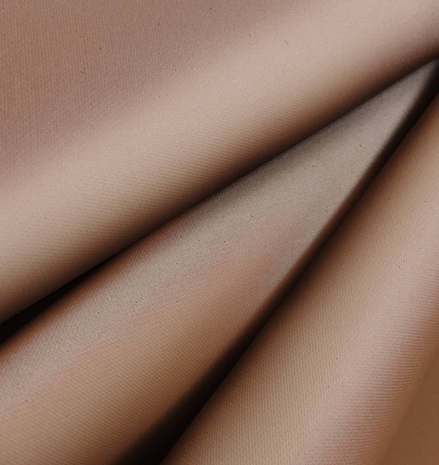 La tela base es la Tela Impermeable - Outdoor, un tejido técnico compuesto por 100% poliéster de gramaje 200 gr/m2 y ancho de 150 cm. Se trata de una tela impermeable con un acabado granulado y rugoso al tacto, y una textura opaca visualmente. El color liso impreso en esta tela es un marrón-nuez con los siguientes valores CMYK: 36 47 53 31. Este tono es característico por su calidez y profundidad, lo que lo convierte en un color muy versátil para combinar con otros tonos, como grises y verdes oscuros.