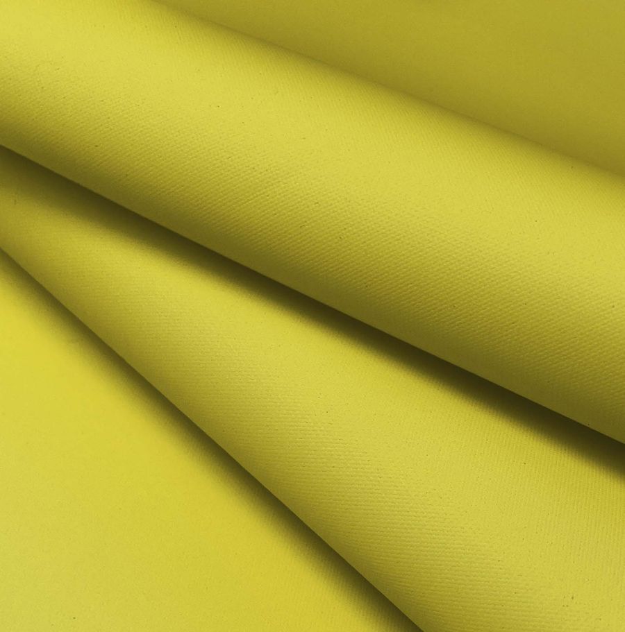La tela base impresa con el color liso Amarillo Azufre se realiza mediante impresión digital textil a una sola cara. Es importante destacar que no se trata de un tejido tintado, sino impreso únicamente en una de sus caras. Además de su impermeabilidad y su aspecto granulado, la tela también es resistente y duradera.