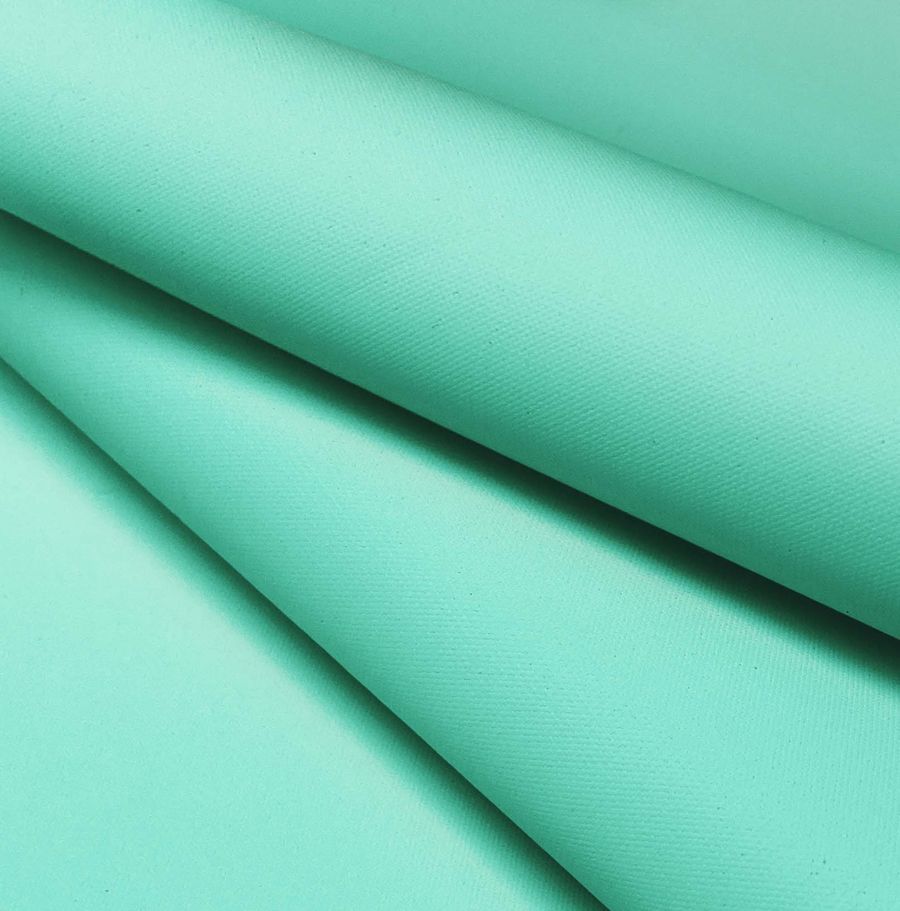 La tela base de esta prenda es la Tela Impermeable-Outdoor, un tejido técnico compuesto al 100% por poliéster de 200 gr/m2 y un ancho de 150 cm, que destaca por su acabado impermeable. El color liso impreso es un verde aguamarina, cuyo CMYK es 46 0 32 0, lo que le aporta un aspecto fresco y natural. Este color secundario combina de manera ideal con otros verdes más claros o amarillos.