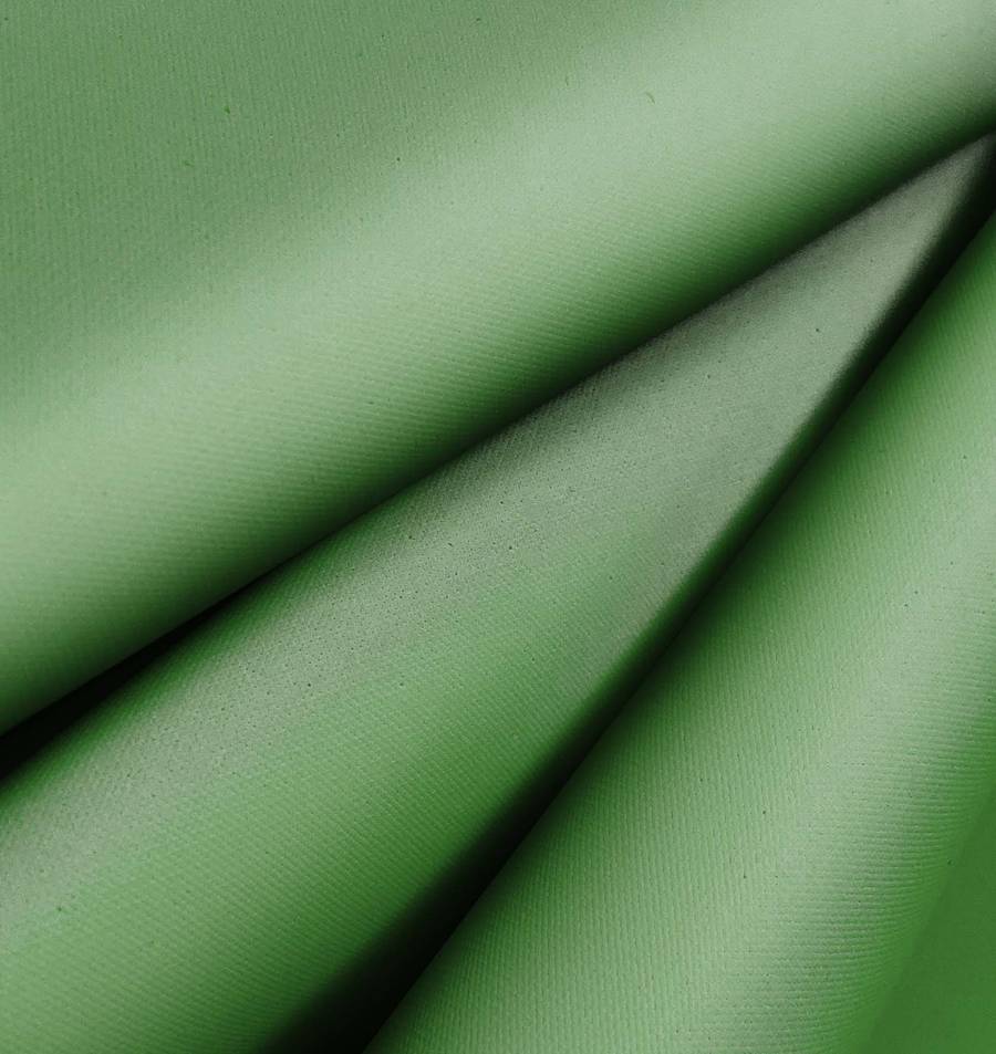 La Tela Impermeable - Outdoor de tejido técnico, con composición 100% poliéster, gramaje de 200 gr/m2 y ancho de 150 cm, presenta un color liso impreso en verde marchito con las tintas cian, magenta, yellow y black (CMYK: 65 31 72 14) y una textura de granulado y rugosidad en su superficie.