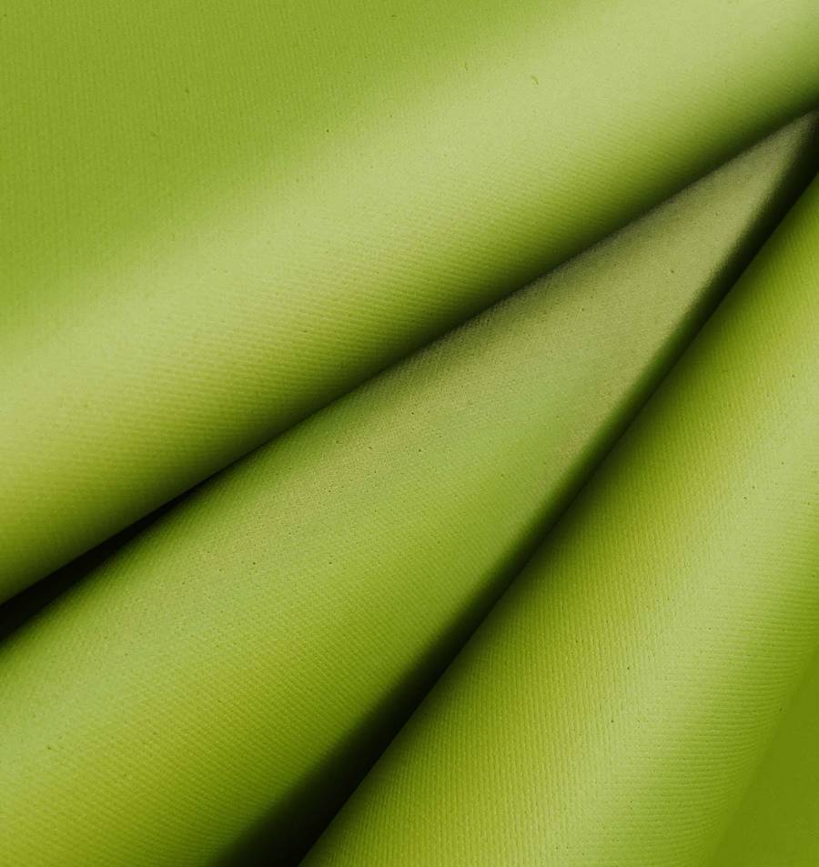 La tela base es la Tela Impermeable - Outdoor, un tejido técnico de 100% poliéster con un gramaje de 200gr/m2 y un ancho de 150cm. El color liso impreso es verde mate, con un CMYK de 55 26 100 10 y está impreso a una sola cara por impresión digital textil. El color secundario es una combinación de azul y amarillo, que en conjunto representan un color fresco y natural que evoca la naturaleza. Este color se combina bien con tonos tierra, creando contrastes y complementando los colores de la temporada.