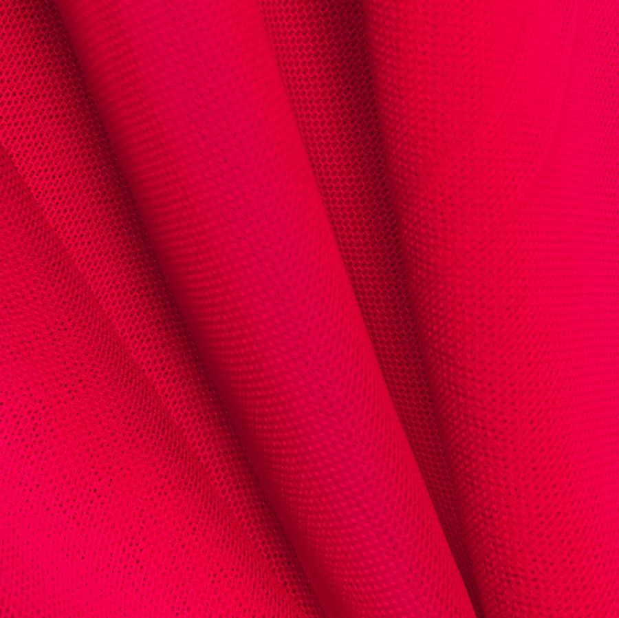 La tela base, Tul Elástico - Oslo, es un tul transparente y elástico compuesto por un 94% de poliéster y un 6% de elastano, con un gramaje de 80 gr/m2 y un ancho de 147 cm. El color liso impreso en la tela es Rojo Carmín, con una composición de tinta cyan 0, magenta 95, yellow 67 y black 0 (CMYK: 0 95 67 0). Este color se presenta con una energía vibrante y potente, que aporta intensidad y pasión a cualquier prenda confeccionada con este tejido. Además, este tono combina excepcionalmente bien con tonos neutros como el blanco y el gris, así como con tonos complementarios como los verdes y los rosados.