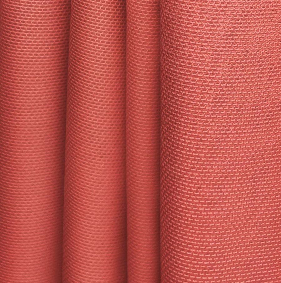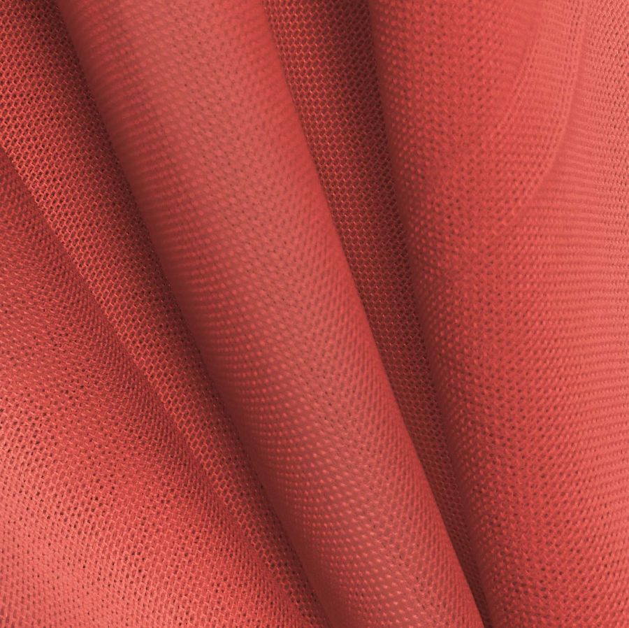 La tela base es un Tul Elástico - Oslo, con un gramaje de 80 gr/m2 y una composición del 94% poliéster y 6% elastano. El color liso impreso es un rojo mate con un contenido de tinta cian de 15, magenta de 80, amarillo de 69 y negro de 4 en CMYK. El color secundario, el magenta, ofrece una sensación de pasión y elegancia, combinando especialmente bien con tonos grisáceos y negros para un aspecto sofisticado. Este tejido está impreso con el color liso a una sola cara por impresión digital textil, no es un tejido tintado sino impreso por una sola cara.