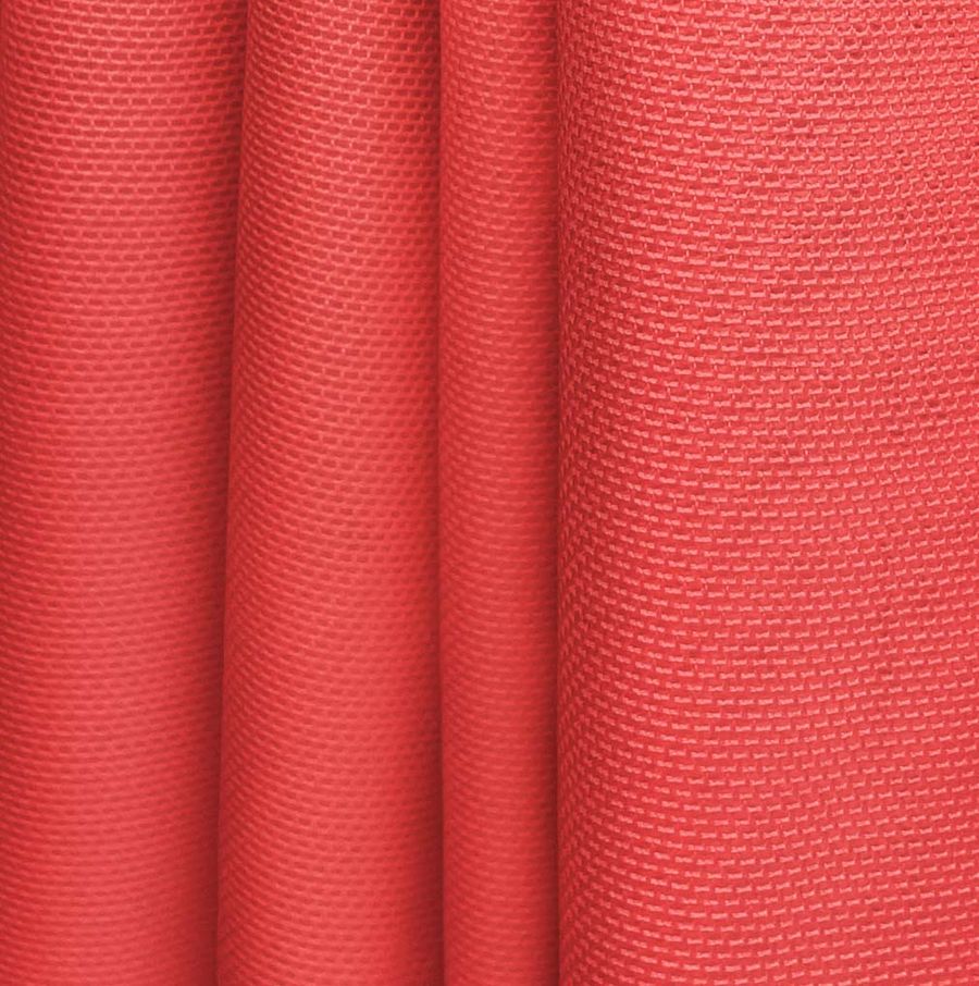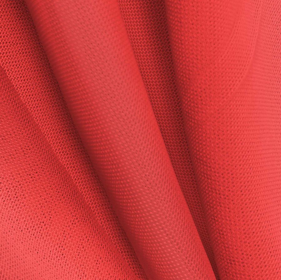La tela base es el Tul Elástico - Oslo, con una composición mayormente de poliéster y una pequeña cantidad de elastano, proporcionando flexibilidad y resistencia en conjunto con su bajo gramaje de 80 gr/m2 y ancho de 147 cm. El color liso impreso en la tela es un Rojo Medio, que contiene cian y magenta en altas proporciones, tanto la tinta amarilla como la negra son esenciales en su proceso de impresión a una sola cara. El color secundario es un tono púrpura oscuro debido a la alta proporción de magenta, y combina perfectamente con tonos azules y verdes.