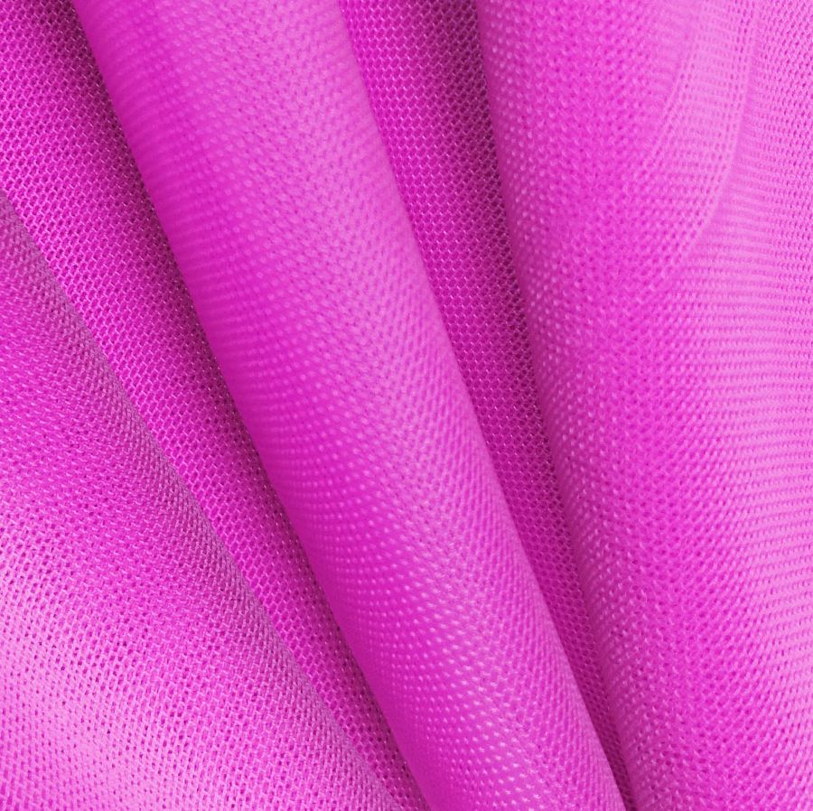 La tela base es el Tul Elástico - Oslo, con una composición de 94% poliéster y 6% elastano, con un gramaje de 80 gr/m2 y con un ancho de 147 cm. El color liso impreso es el Rosa Deslumbrante Razzle, cuyo CMYK es 23 79 0 0. Este color se describe como un rosa intenso y vibrante, atrae la atención y es llamativo, evocando sensaciones de creatividad y alegría. Además, el rosa pálido y el dorado complementan muy bien este color intenso para crear una paleta armoniosa. Este tejido está impreso con el color liso a una sola cara por impresión digital textil.