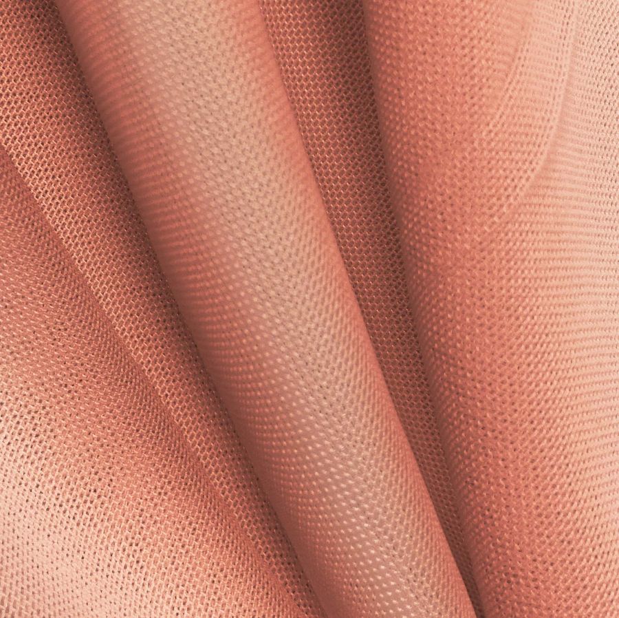La tela base, Tul Elástico - Oslo, es una tela transparente y elástica compuesta de 94% poliéster y 6% elastano. El color liso impreso es un hermoso tono rosa-salmón con una perfecta combinación de 0% de tinta cian, 58% de tinta magenta y 50% de tinta amarilla, obteniendo un CMYK de 0 58 50 0. Este color evoca sensaciones de alegría, creatividad y femineidad. Se combina muy bien con colores neutros como el gris y el negro para dar una apariencia elegante y sofisticada.