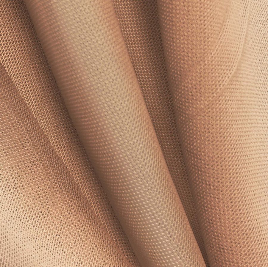 La tela base de este producto es el Tul Elástico Oslo, compuesta por 94% poliéster y 6% elastano con un gramaje de 80 gr/m2 y un ancho de 147 cm. El color liso impreso es una mezcla de marrón y arenisca, con un CMYK de 19,47,54,7. Este color refleja una sensación de calidez y elegancia, transmitiendo la esencia natural y sofisticada al mismo tiempo. El tono marrón pone de manifiesto una sensación de confort, mientras que el tono arenisca aporta un toque de luminosidad.