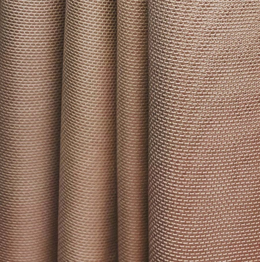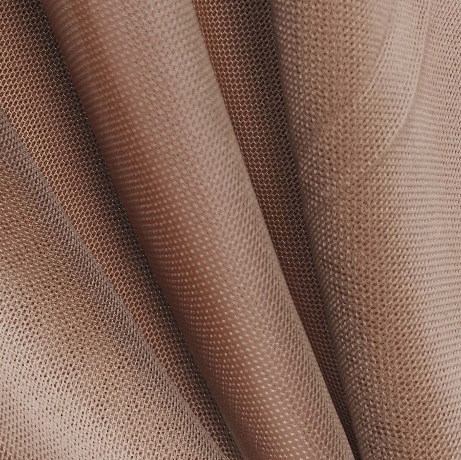 La tela base es el Tul Elástico - Oslo, compuesta por un 94% de poliéster y un 6% de elastano, con un gramaje de 80 gr/m2 y un ancho de 147 cm. El color liso impreso en esta tela es Marrón Canela, con un CMYK de 35 55 61 39. Este color refleja la calidez del otoño y se complementa armoniosamente con tonos arena, beige y terracota.