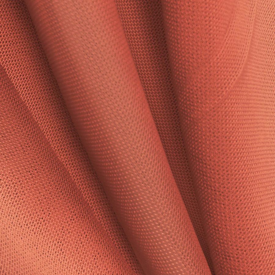 El Tul Elástico - Oslo es un tejido fino y elástico compuesto por 94% POLIÉSTER y 6% ELASTANO, con un gramaje de 80 gr/m2 y un ancho de 147 cm. Su color base es un marrón Cedar Chest, descrito con un CMYK de 17 74 70 5, que confiere un toque elegante y sofisticado a la prenda. Este color se combina a la perfección con tonos neutros, como el blanco o el negro, y también con tonos rojizos y dorados.