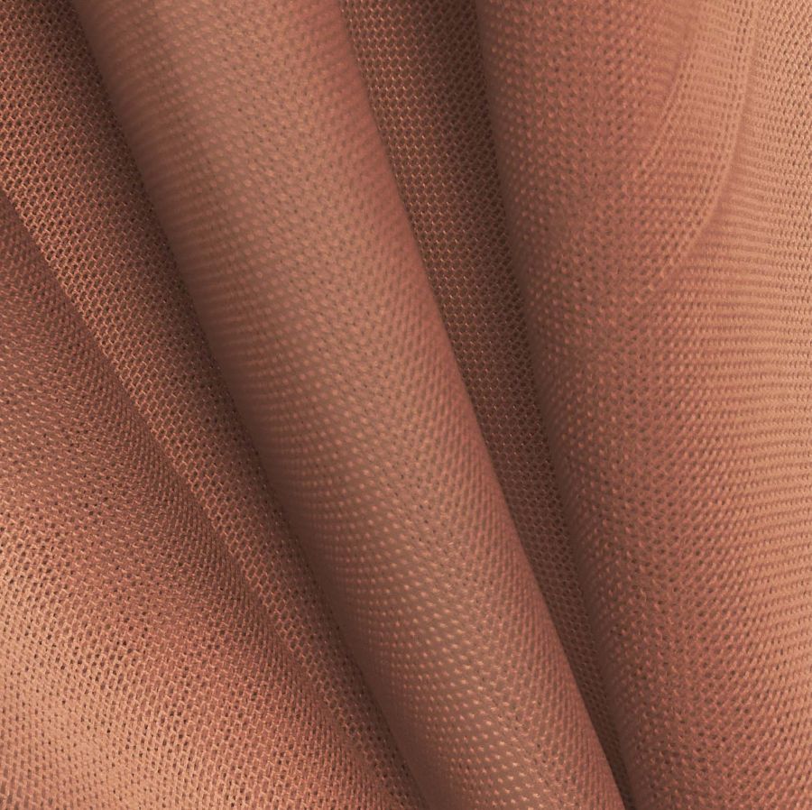 La tela base es el Tul Elástico - Oslo, compuesto mayoritariamente por poliéster y elastano con un gramaje de 80 gr/m2 y un ancho de 147 cm. El color liso impreso es Marron Cuero Viejo, representado por el CMYK 29 60 61 25. Este color se asemeja a un marrón oxidado, con un matiz terroso y vintage que evoca autenticidad y naturalidad. Combina bien con tonos tierra, beige y naranjas oscuros.