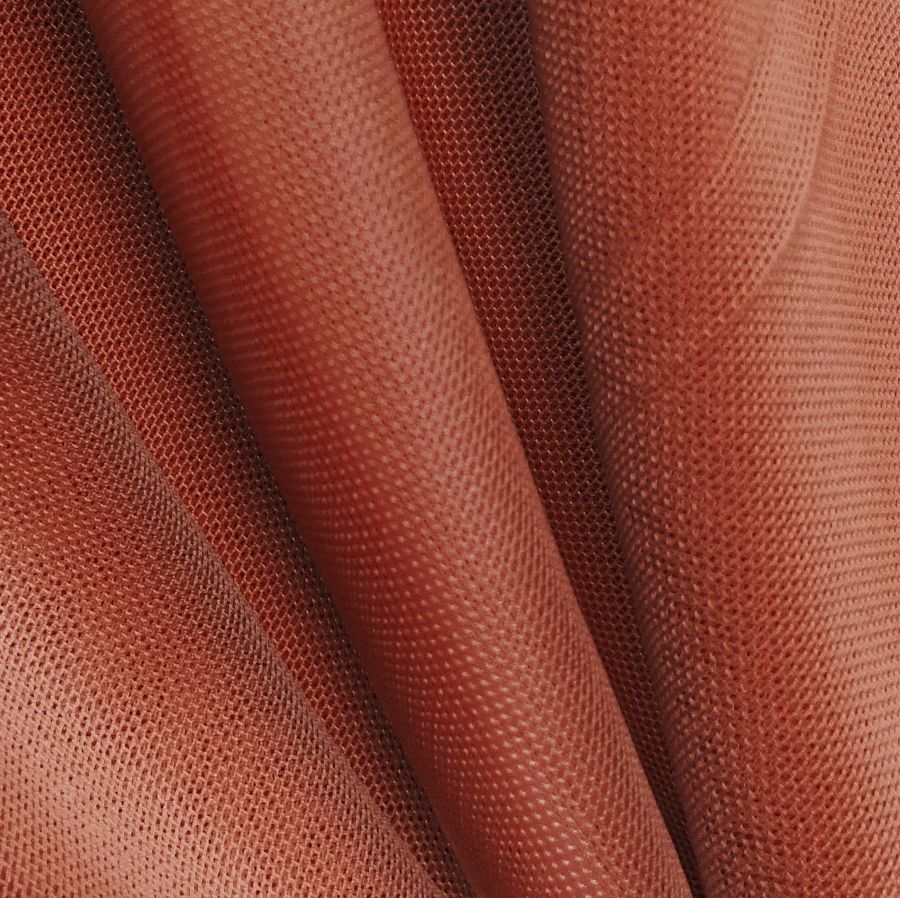 La tela base es un Tul Elástico - Oslo de 94% POLIÉSTER y 6% ELASTANO, con un gramaje de 80 gr/m2 y un ancho de 147 cm en color liso impreso en Marron Kobe, cuyo contenido en CMYK es de 29 89 96 34. Este color marrón oscuro con tonalidades rojizas simboliza la madurez y la estabilidad, representando la tierra y la madera. Además, combina con otros colores como el blanco, negro, gris, nude y dorado, aportando sobriedad y elegancia a cualquier prenda.