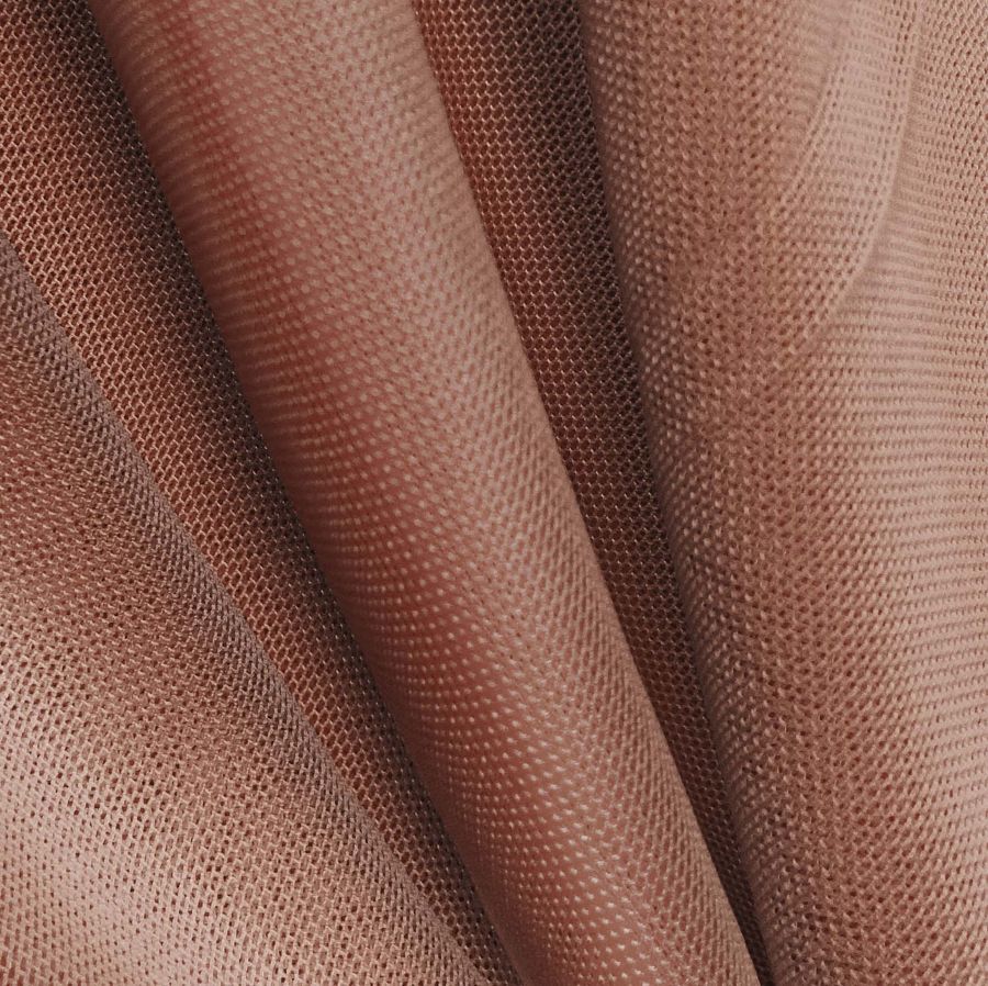 La tela base, Tul Elástico - Oslo, es un tejido transparente y elástico con un gramaje de 80 gr/m2 y una composición de 94% POLIÉSTER y 6% ELASTANO. El color liso impreso en este tejido es un Marrón con Pátina, representado por el CMYK 33 65 67 38. Este color oscuro y sofisticado combina bien con tonos tierra y neutros, así como con tonalidades metálicas como el dorado y el plateado.