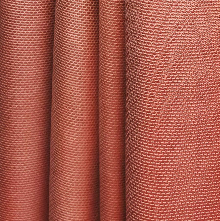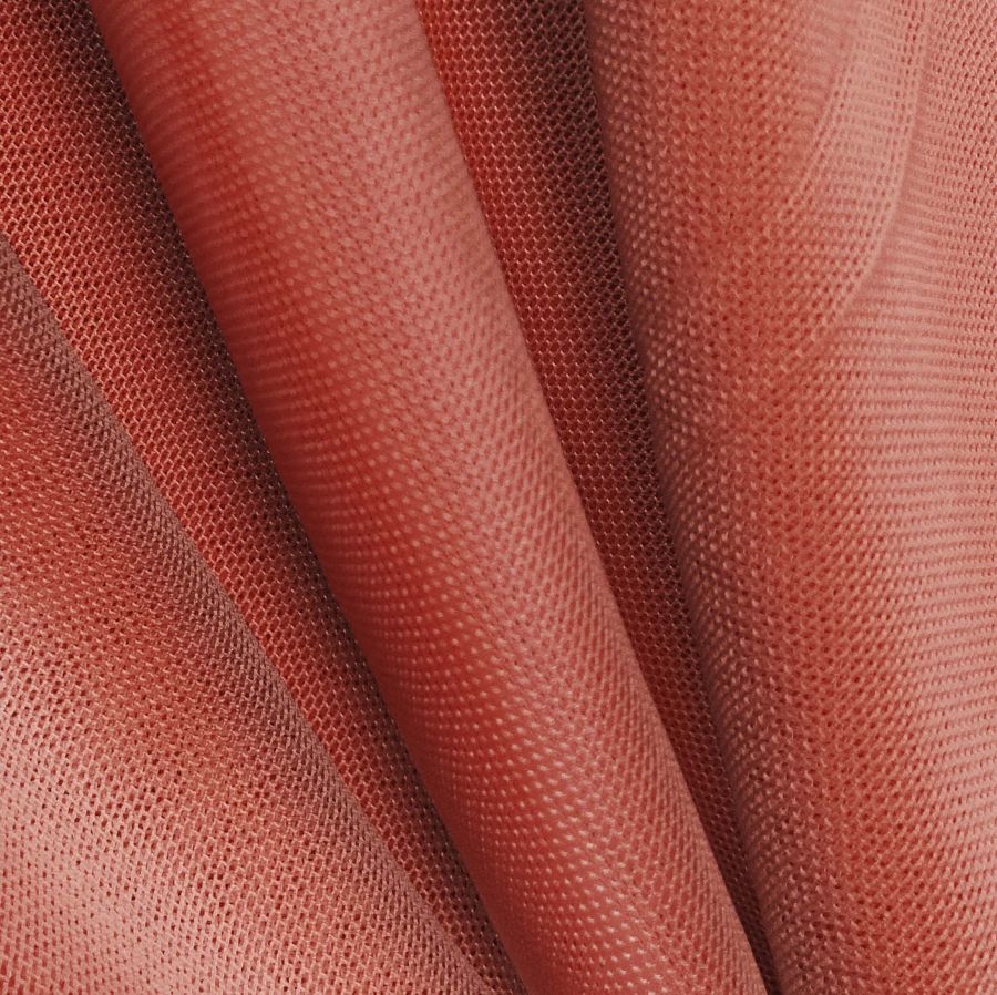 La tela base es un Tul Elástico - Oslo de 94% poliéster y 6% elastano en un tono Marrón-Rojo Pardusco, reflejado en el CMYK 26 83 81 21. El color secundario es cálido, que evoca la tierra y la naturaleza, y combina maravillosamente con otros tonos tierra, marrones y naranjas. El tejido está impreso con color liso a una sola cara por impresión digital textil.