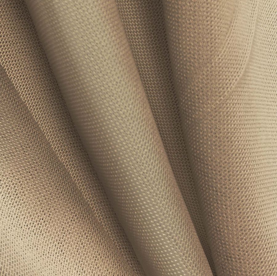 La tela base es el Tul Elástico - Oslo, con una composición de 94% poliéster y 6% elastano, con un gramaje de 80 gr/m2 y un ancho de 147 cm. El color liso impreso es Marrón Sándalo, con una combinación de tintas CMYK de 32 39 52 21. Se caracteriza por su textura visual transparente y tacto delgado y elástico.