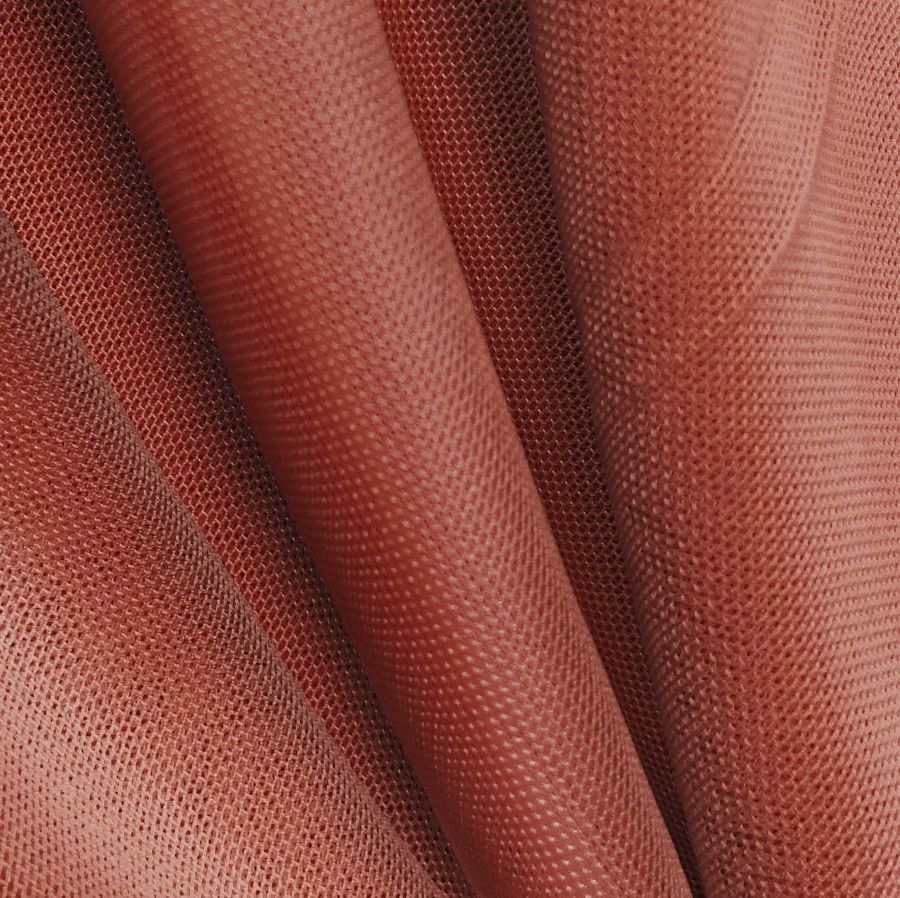 La tela base es el Tul Elástico - Oslo, compuesta por 94% POLIÉSTER y 6% ELASTANO, con un gramaje de 80 gr/m2 y un ancho de 147 cm. Su color liso impreso es Marrón Sombra Tostada, con una composición CMYK de 30 85 84 34, lo que crea un tono marrón oscuro y cálido con subtonos rojizos. El color secundario aporta un toque diferenciador y se combina perfectamente con tonos tierra, beige y verdes.