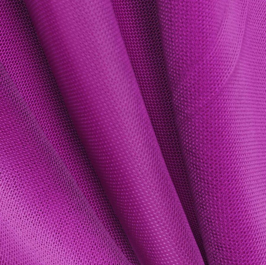 La tela base es el Tul Elástico - Oslo, con una composición de 94% poliéster y 6% elastano, un peso de 80 gr/m2, un ancho de 147 cm y una temporada atemporal. El color liso impreso es de tono morado, específicamente purple live, con una tinta Cyan 58, Magenta 100, Yellow 12, Black 4 y CMYK 58 100 12 4. Este color morado es intenso y vibrante, simbolizando la creatividad, la sensualidad y la pasión. El tono purpura combina perfectamente con tonos pastel como el rosa palo, el blanco, el gris o el beige.
