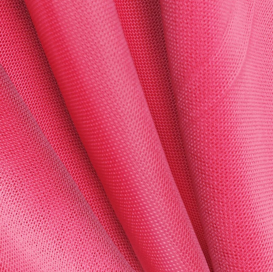 La tela base es el Tul Elástico - Oslo, un tul con una composición de 94% poliéster y 6% elastano que le otorga elasticidad. El color liso impreso es un Rojo Radical Red, que se crea a partir de una combinación de 0% de tinta Cyan, 87% de tinta Magenta, 44% de tinta Yellow, y 0% de tinta Black, con un CMYK de 0 87 44 0.