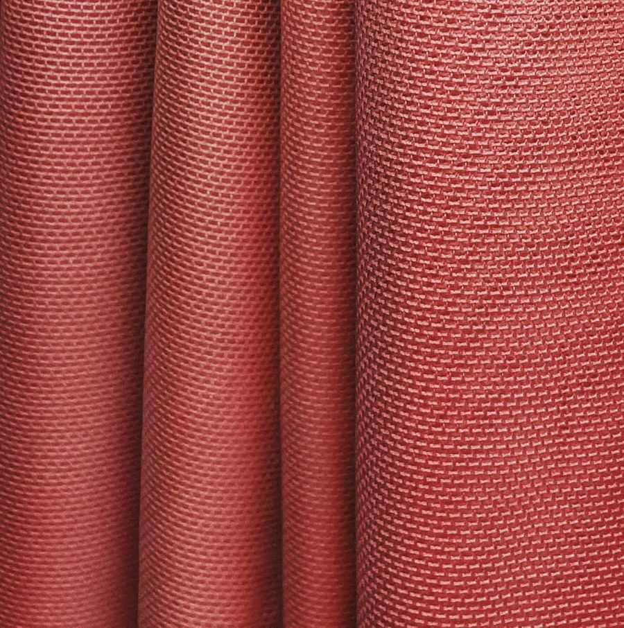 La tela base es transparente, delicada y elástica al tacto. El color se imprime digitalmente en una sola cara, lo que significa que la parte trasera de la tela es blanca y no tiene ningún patrón o tinte. El color rojo Auburn resalta en la tela base, lo que le da un aspecto sofisticado y elegante.