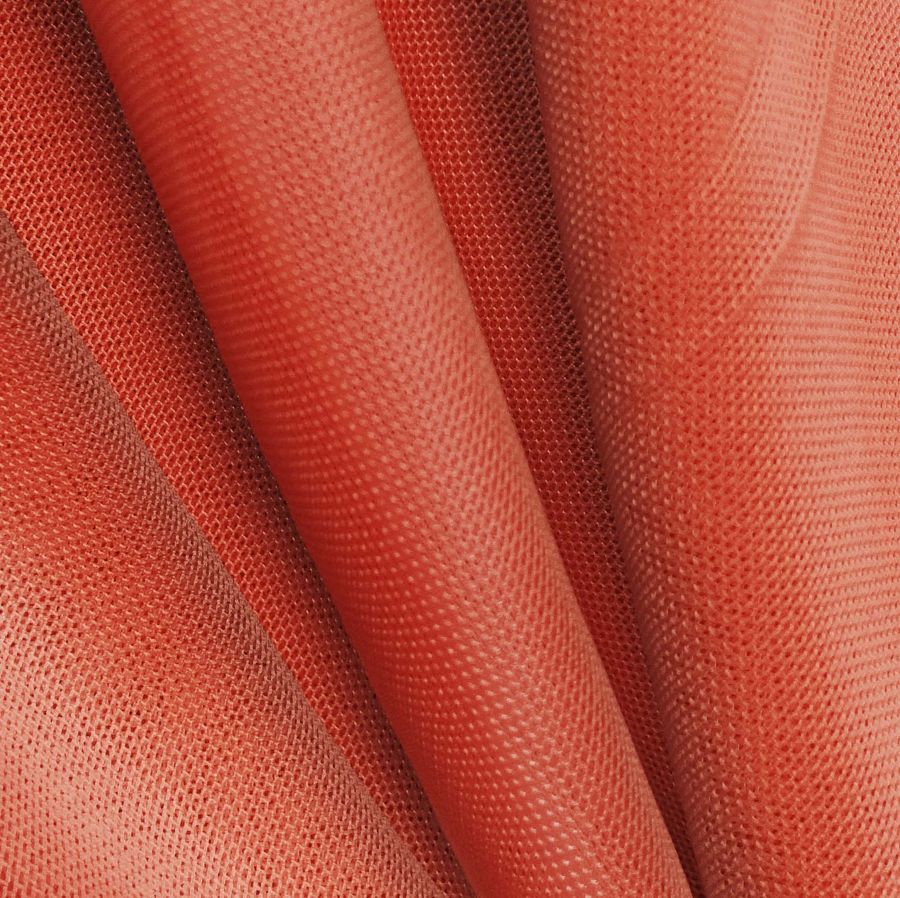 La tela base es el Tul Elástico - Oslo, compuesta por un 94% de poliéster y un 6% de elastano, con un gramaje de 80 gr/m2 y un ancho de 147 cm. El color liso impreso es rojo pastel, con una combinación de tinta de cyan 17, magenta 87, yellow 93 y black 7, indicadas por el CMYK 17 87 93 7. Este tono pastel es un color suave y delicado, que evoca la feminidad, la dulzura y la tranquilidad, y combina particularmente bien con tonos análogos como el rosa suave, el lila y el salmón.