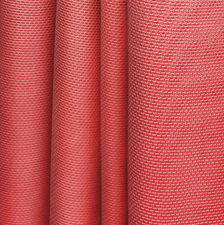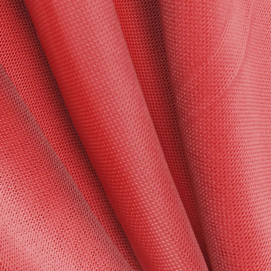 La tela base es Tul Elástico - Oslo, compuesta por un 94% de poliéster y un 6% de elastano, con un gramaje de 80 gr/m2 y un ancho de 147 cm. El color liso impreso es rojo ultrarrojo, que se consigue mediante una combinación de tinta cyan (14), magenta (91), yellow (79) y black (4) en un proceso de impresión digital textil a una sola cara.