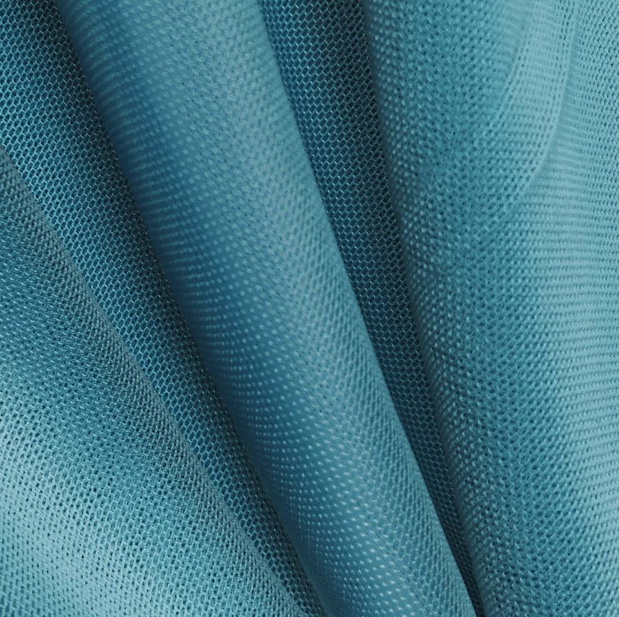 La tela base, Tul Elástico - Oslo, es un tul transparente y delicado compuesto de 94% poliéster y 6% elastano. El color liso impreso es un suave tono de Azul Agua, compuesto por las tintas Cyan (82), Magenta (39), Yellow (37) y Black (21) en un perfil de color CMYK (82 39 37 21). Este color se puede combinar especialmente bien con tonos claros como el rosado, el coral y el blanco.