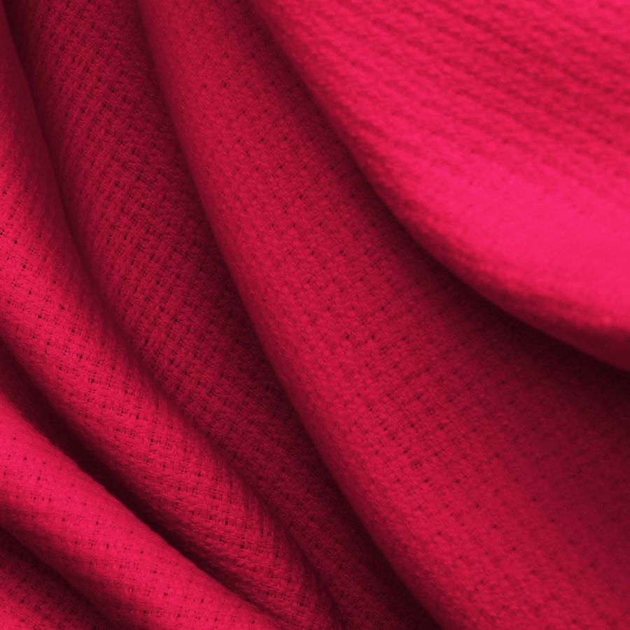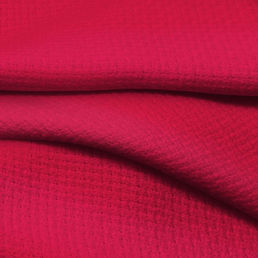 La tela base es un tweed de poliéster con un gramaje de 420 gr/m2 y un ancho de 150 cm. El color liso impreso en esta tela es rojo amaranto con una composición de tinta CMYK de 8 98 64 2. El color rojo amaranto es un tono intenso y brillante que combina perfectamente con matices cálidos como el naranja y el amarillo, así como con tonos fríos como el verde y el azul.