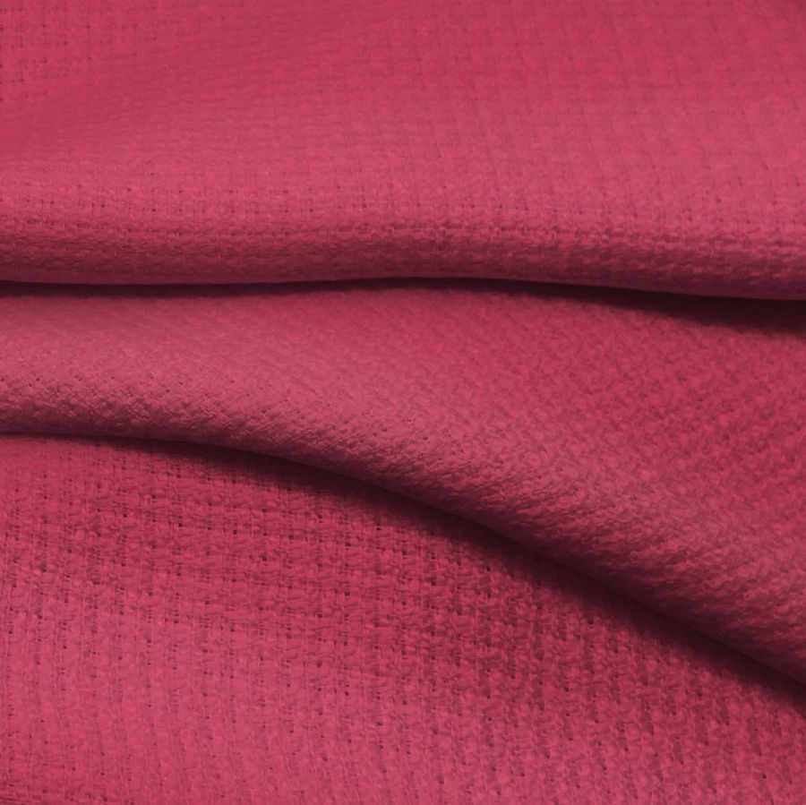 La tela base es un tweed de chanel compuesto por 100% poliéster, de 420 gr/m2 y 150 cm de ancho. El color liso impreso, Rojo Deseo, se compone de cian 19, magenta 86, amarillo 51 y negro 8 en CMYK. Este tono evoca la intensidad y el apasionamiento propios del deseo, combinando con otros rojos y naranjas. La tela está impresa a una sola cara por impresión digital textil en alta resolución. La textura es rígida al tacto.