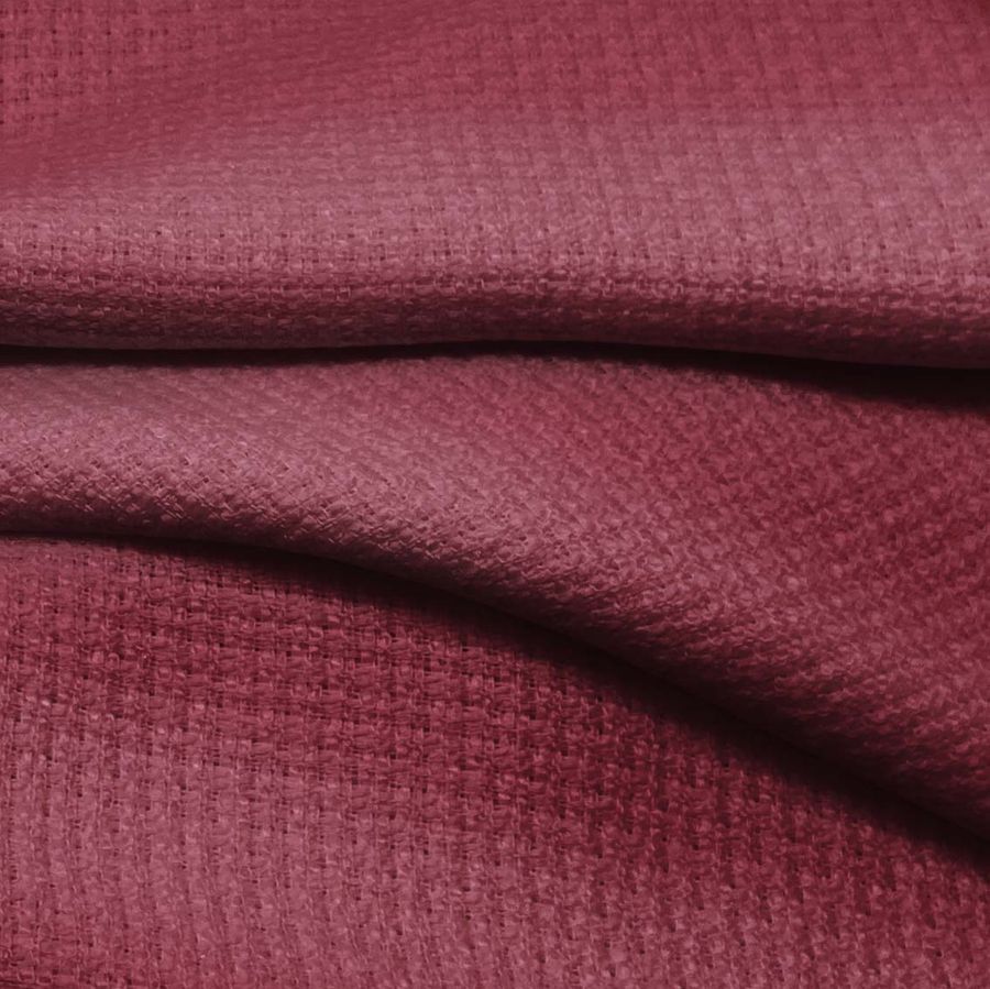 La tela base es un Tweed-Chanel de 100% poliéster, con un gramaje de 420 gr/m2 y un ancho de 150 cm. El color liso impreso es rojo-granate, con una tinta cyan de 33, magenta de 83, yellow de 51 y black de 42, formando un CMYK de 33 83 51 42. Este color simboliza la pasión y la fuerza, y técnicamente es un color cálido y con una alta saturación que combina bien con colores neutros como el gris y el negro, así como con colores complementarios como el verde y el azul. El tejido está impreso con el color liso a una sola cara por impresión digital textil, lo que significa que la tinta se imprime sobre la superficie de la tela base y no penetra en ella como en un tejido tintado.