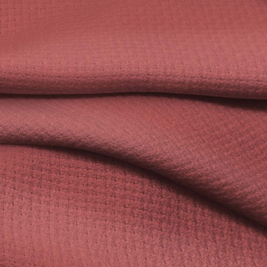 La tela base es Tweed Chanel, compuesta por 100% poliéster, con un gramaje de 420 gr/m2 y un ancho de 150 cm. El color liso impreso es Rojo Piel Roja, con un CMYK de 24 73 56 16. Este color se define por su intensidad, profundidad y carácter ardiente. En combinación con el gris, el negro y el blanco, ofrece un aspecto elegante y sofisticado. La tela está impresa a una sola cara por impresión digital textil.