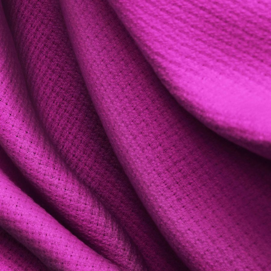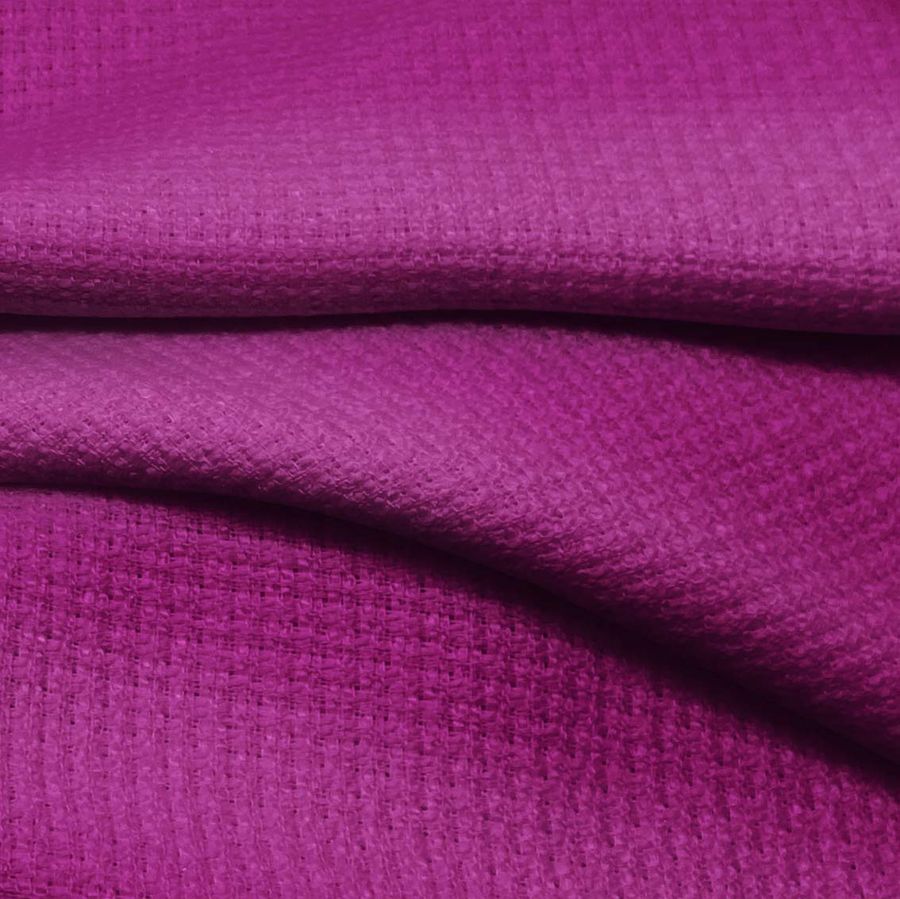 La tela base de este tejido impreso es el Tweed-Chanel, una tela de tweed con composición 100% poliéster de 420 gr/m2 y una anchura de 150 cm. El color liso impreso es una mezcla de rojo y púrpura, con un CMYK de 50 100 18 9, lo que le da un tono intenso y vibrante. Este color evoca la pasión, el poder y la elegancia. El púrpura representa la nobleza, la creatividad y la sofisticación, mientras que el rojo simboliza la energía, la pasión y la fuerza. El color secundario impreso combina muy bien con tonos neutros como el blanco, gris y negro, así como también con tonos tierra como el beige o marrón.