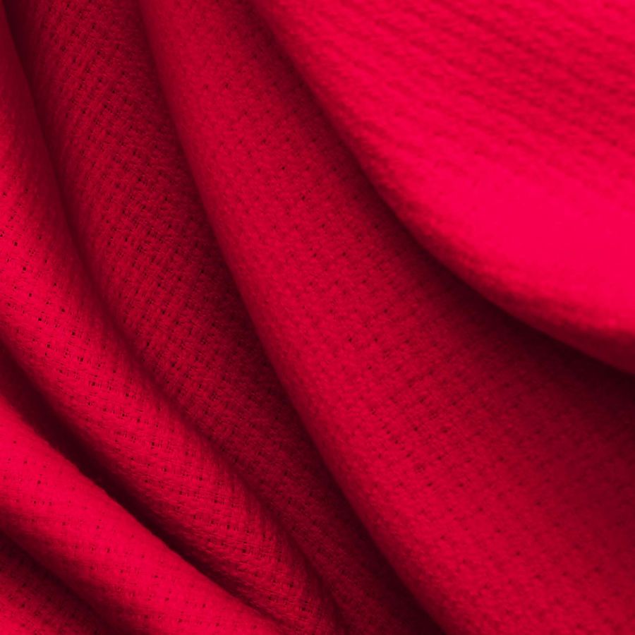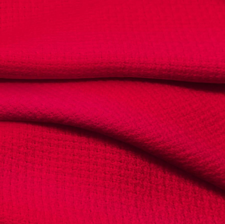 La tela Tweed - Chanel de 100% poliéster es elegante y sofisticada, con un gramaje de 420 gr/m2 y un ancho de 150 cm. El color liso impreso en esta tela es un intenso rojo carmín con un CMYK de 0 100 77 0, que le da un toque de pasión y energía. Este color combina perfectamente con tonos neutros como el beige y el blanco, creando contrastes ideales.