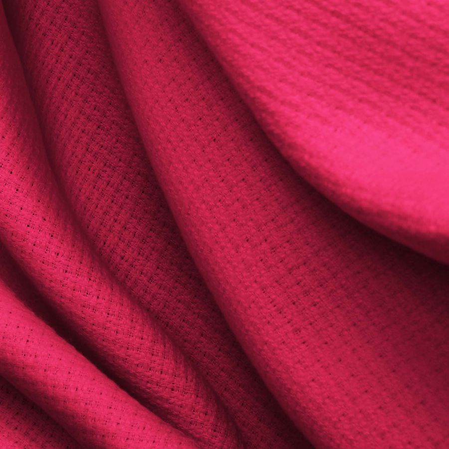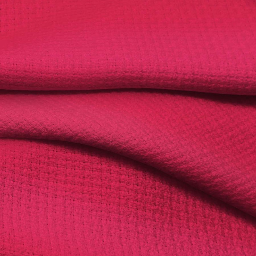 La tela Tweed - Chanel impresa con este color Rojo Crayola es rígida al tacto, lo que no la hace una tela maleable, por lo que es ideal para ropa estructurada como chaquetas y blazers, así como para cojines y otros accesorios del hogar.