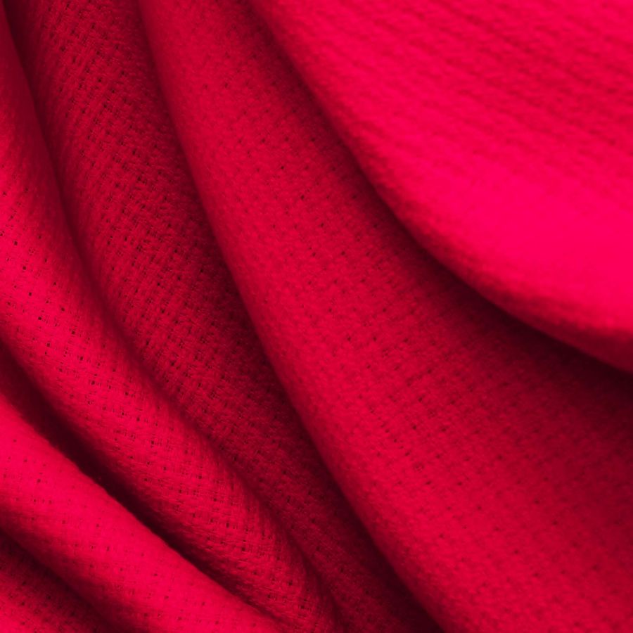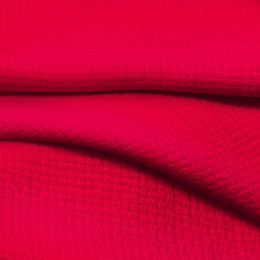 La tela base es Tweed - Chanel, compuesta por 100% poliéster con un gramaje de 420 gr/m2 y un ancho de 150 cm. El color liso impreso es Rojo Carmín, con un CMYK de 0 95 67 0, lo que le da un tono carmesí intenso y vibrante. Este color se combina armoniosamente con tonos tierra, dorados y neutros, así como con colores más brillantes como el azul eléctrico o el verde esmeralda.